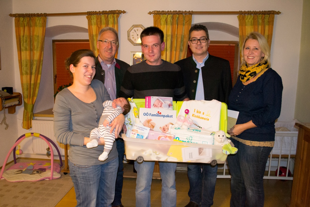 Mit besonders großer Freude haben die Mitglieder der Projektgruppe "Familienfreundlichen Gemeinde" unlängst das "Waisat" für die kleine Miriam zusammengepackt. Astrid Lüftinger, Gabi Pühringer, Sozialausschussobmann Ingo Dörflinger und Bürgermeister Hans Kronberger machten sich gemeinsam in den Ortsteil Wahl auf, genauer gesagt zum "Hiebl z‘ Wahl" um den Eltern Michael Holzinger und Bettina Riedler zur Geburt ihrer Tochter Miriam zu gratulieren. Das ganz Besondere daran ist, dass die kleine, schwarzhaarige, unheimliche süße Miriam als 2.000ste Kirchhamerin im Krankenhaus Wels gesund und wohlbehalten zur Welt gekommen ist! Dies wurde in der gemütlichen Stube der Familie Holzinger gemeinsam mit Oma Christine und Schwesterchen Madlen entsprechend gefeiert. Kirchham setzt auf Kinder- und Familienfreundlichkeit! Für Bürgermeister Hans Kronberger ging damit ein lang ersehnter Wunsch in Erfüllung: "Für mich stand das Schlagwort von den "2000 Einwohnern" einfach als Zielsetzung, dass wir in Kirchham wachsen wollen, dass alle unsere jungen Leute eine Wohnung oder einen Baugrund in Kirchham bekommen könne, soweit sie das möchten und das Kinder-und Familienfreundlichkeit im Mittelpunkt aller Maßnahmen der Gemeinde stehen muss. Dies gilt auch weiterhin und hat für mich kommunalpolitisch immer oberste Priorität!"