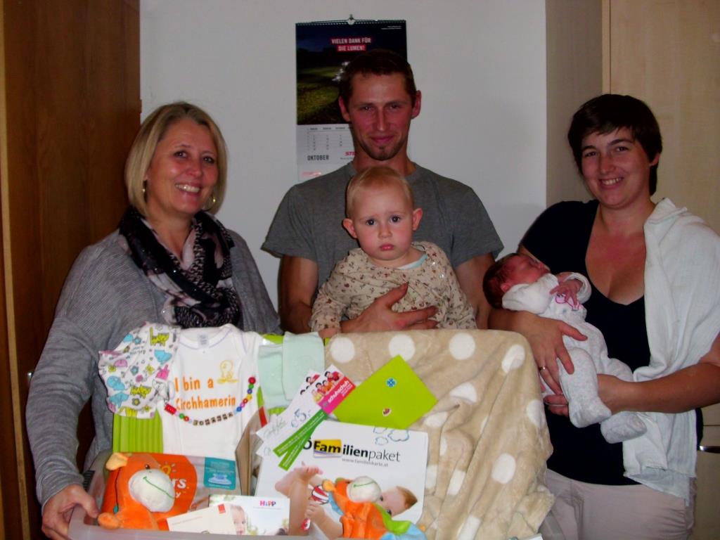 Als ganz persönliches Geschenk überreichten sie die liebevoll zusammengestellte Kirchhamer Geschenkbox. Auch die besten Glückwünsche seitens der Gemeinde überbrachten sie bei ihrem Besuch. Auch die große Schwester Verena freute sich über die Geschenkbox.