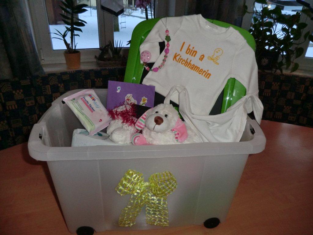 („I bin a KirchhamerIn“),  Windeln, Babypatscherl, Kirschkernkissen und vieles mehr.  Erstmals wurde das „Kirchhamer Waisat“ an die Familie Bencics, Hagenmühle 27, anlässlich der Geburt ihres Mäderls Aida überbracht und löste bei Eltern und den drei Geschwistern große Freude aus.