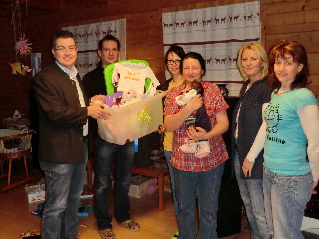 Foto (Gemeinde Kirchham): v.l.n.r.: Sozialreferent Ingo Dörflinger ABL, Familie Bencics mit Säugling Aida, Astrid Lüftinger und Gabi Pühringer bei der ersten Übergabe des Kirchhamer „Waisats“.