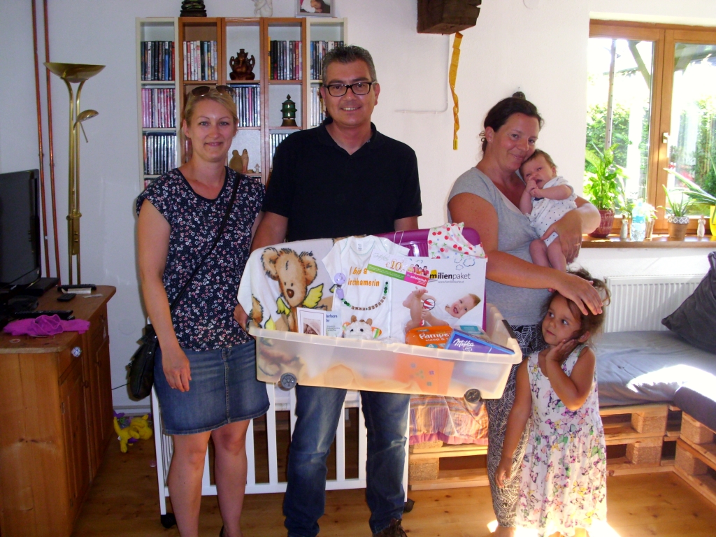 Mit einem Kirchhamer Waisat, zusammengestellt vom Führungsteam der Familienfreundlichen Gemeinde, konnten kürzlich Astrid Lüftinger und Bianca Fischer sowie der Sozialausschussobmann Ingo Dörlinger die Eltern Claudia Pesendorfer und Martin Fuhrberger, Mühlenstraße 3, überraschen. Anlässlich der im April geborenen  Tochter Anna-Sophie überbrachten sie das liebevoll zusammengestellte Kirchhamer Waisat und die besten Glückwünsche seitens der Gemeinde.