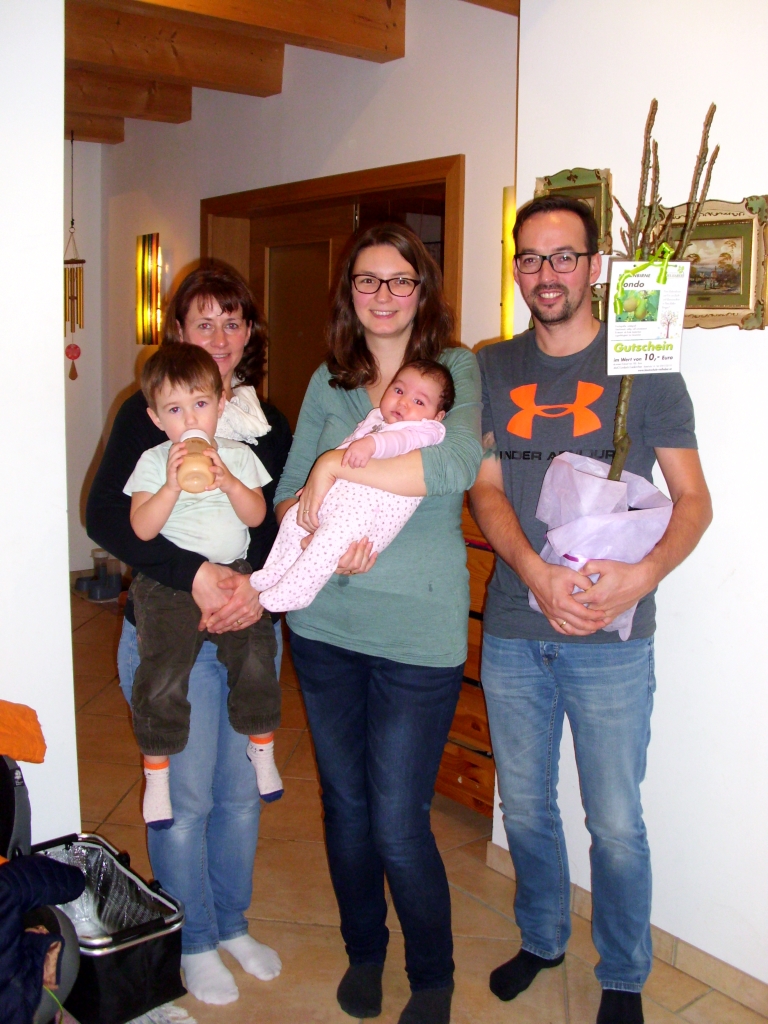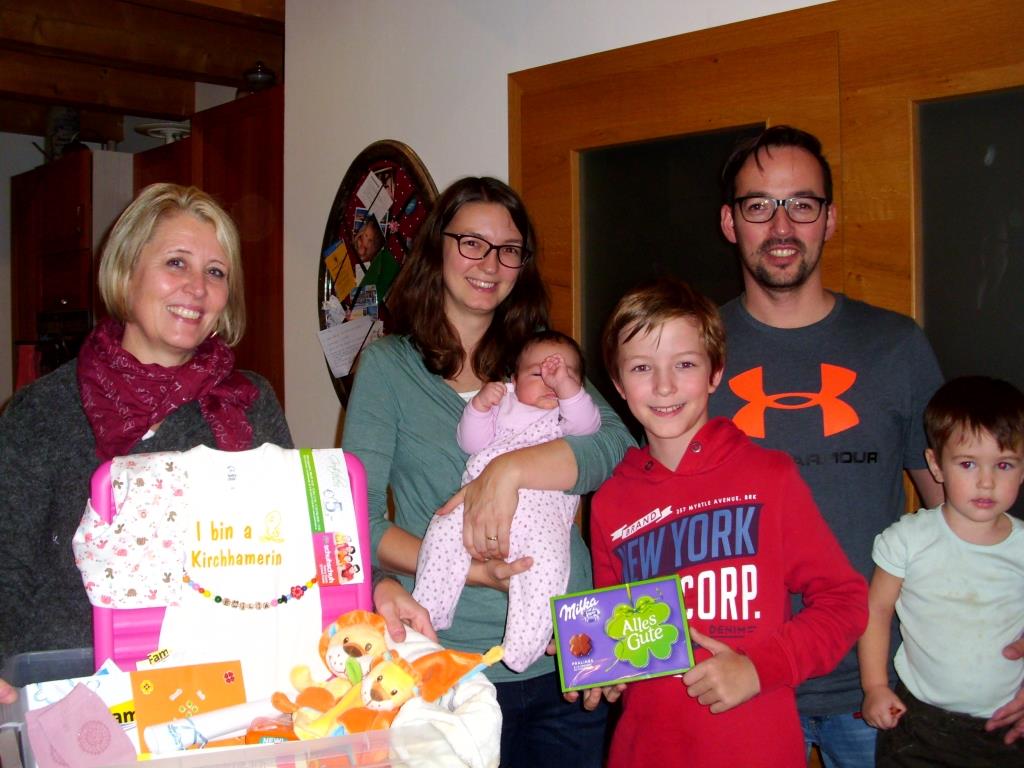 | Nicht nur das Christkind bringt in Kirchham Geschenke, nein auch die Mitglieder der Familienfreundlichen Gemeinde waren noch vor Weihnachten fleißig unterwegs um die jungen Familien mit einem Geschenk der Gemeinde, dem Kirchhamer Waisat zu überraschen. So waren das Führungsteam mit Astrid Lüftinger und Gabi Pühringer kürzlich bei Beatrice u. Carlo Zambelli, Wiesenweg 3 um ihnen zu ihrer am 1. Oktober geborenen Tochter Emilia Maria recht herzlich zu gratulieren. Die gesamte Familie freute sich über die liebe Aufmerksamkeit. In diesem Zusammenhang wurde auch der noch nicht überreichte Lebensbaum, ein Obstbaum, überreicht. Auch wir schließen uns den Glückwünschen ganz herzlich an! |