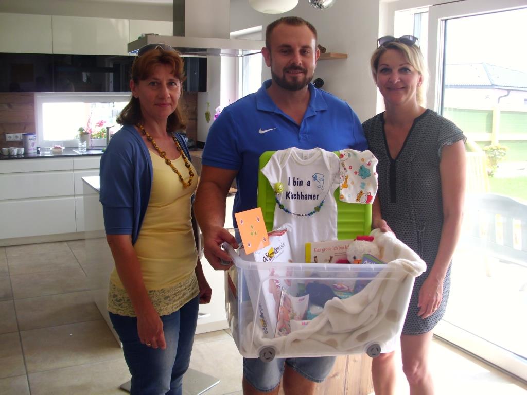 Mit großer Freude konnten das Team der Familienfreundlichen Gemeinde Kirchham wieder ein Kirchhamer Waisat überbringen und damit junge Eltern in unserem Ort begrüßen. Gabi Pühringer und Astrid Lüftinger überraschten mit dieser persönlich zusammengestellten Geschenkbox der Familienfreundlichen Gemeinde die glücklichen Eltern Simone Pointl und Martin Holzinger, Bahnhofweg 38, und wünschten damit alles Gute auch seitens der Gemeinde  für ihren Sohn Hannes, der Mitte April das Licht der Welt erblickte.