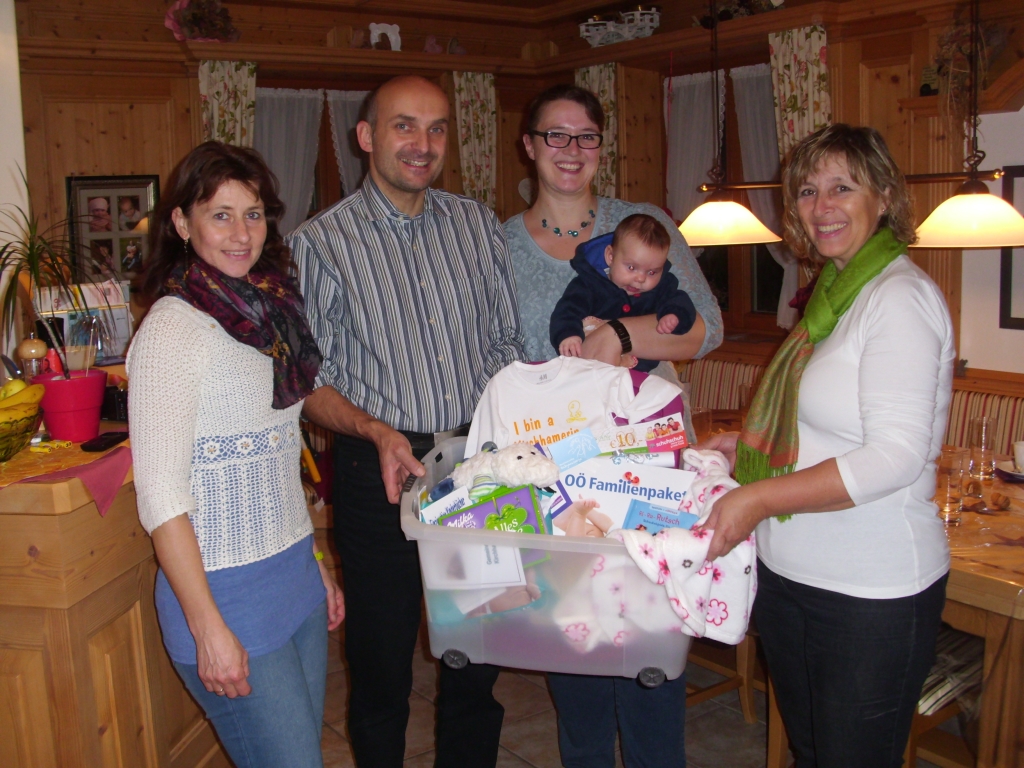 Den stolzen Eltern Jana und Oswald Cecon, Kampesberg 4, statteten Astrid Lüftinger, Gabi Pühringer und Gerti Huemer vom Team der Familienfreundlichen Gemeinde Kirchham einen Besuch ab und überbrachten dabei das "Kirchhamer Waisat" für ihre Ende August geborene Tochter Helene Victoria. Neben der persönlich und liebevoll zusamengestellten Geschenkbox hatten sie auch die besten Glückwünsche seitens der Gemeinde im Gepäck.