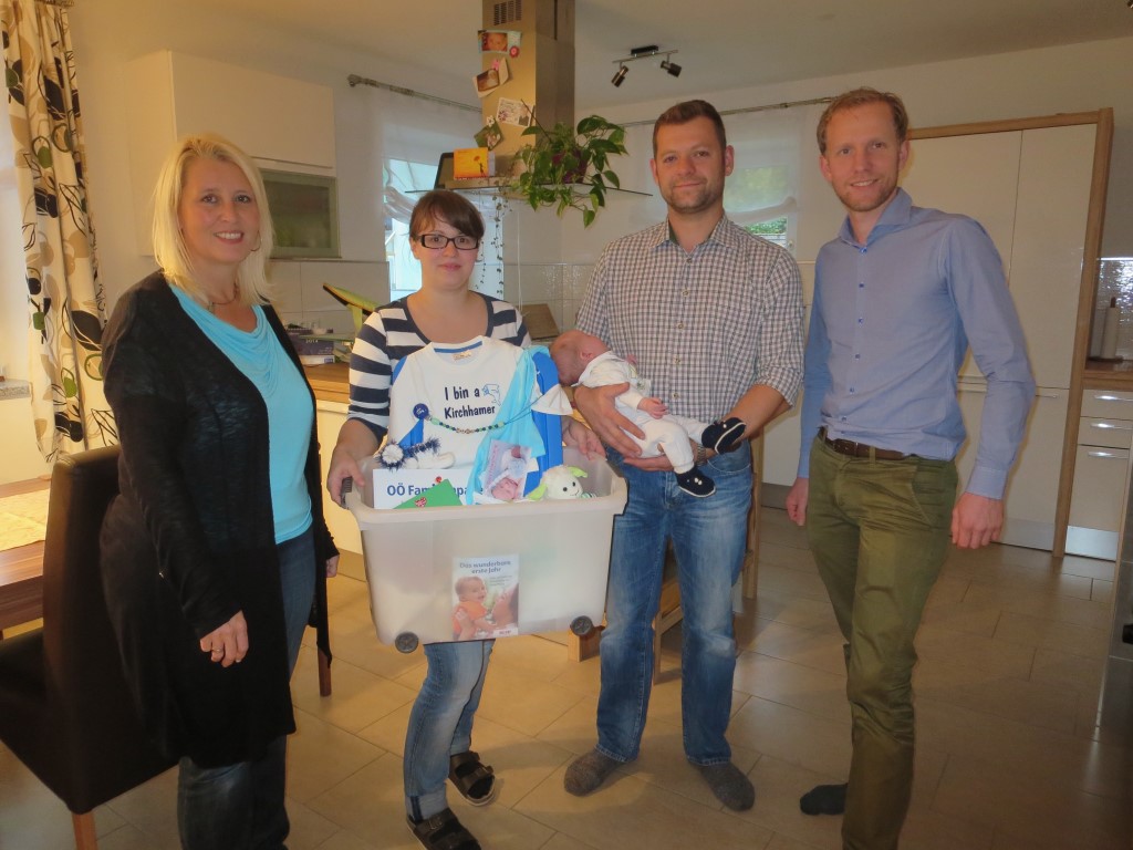 Den stolzen Eltern Christine Buchegger und Thomas Preinstorfer, Hagenmühle 11, konnten Bianca Fischer und Astrid Lüftinger vom Team der Familienfreundlichen Gemeinde Kirchham sowie GR Christian Brunner das "Kirchhamer Waisat" für ihren Ende September geborenen Sohn Karl Michael überbringen. Gleichzeitig überbrachten sie auch die besten Glückwünsche seitens der Gemeinde. Auch wir wünschen der jungen Familie alles Gute und Gottes Segen. |