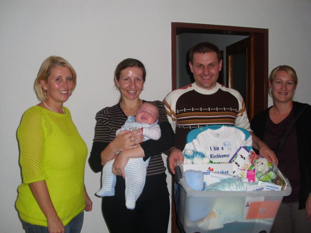 Den stolzen Eltern Alina-Carina und Marius-Ioan Muste, Kirchham 37, konnten Astrid Lüftinger, Gabi Pühringer und Bianca Fischer vom Team der Familienfreundlichen Gemeinde Kirchham das "Kirchhamer Waisat" für ihren Ende Juli geborenen Sohn Lukas überbringen. Neben der liebevoll zusamengestellten Geschenkbox überbrachten sie auch die besten Glückwünsche seitens der Gemeinde. Auch wir wünschen der jungen Familie alles Gute und Gottes Segen. |