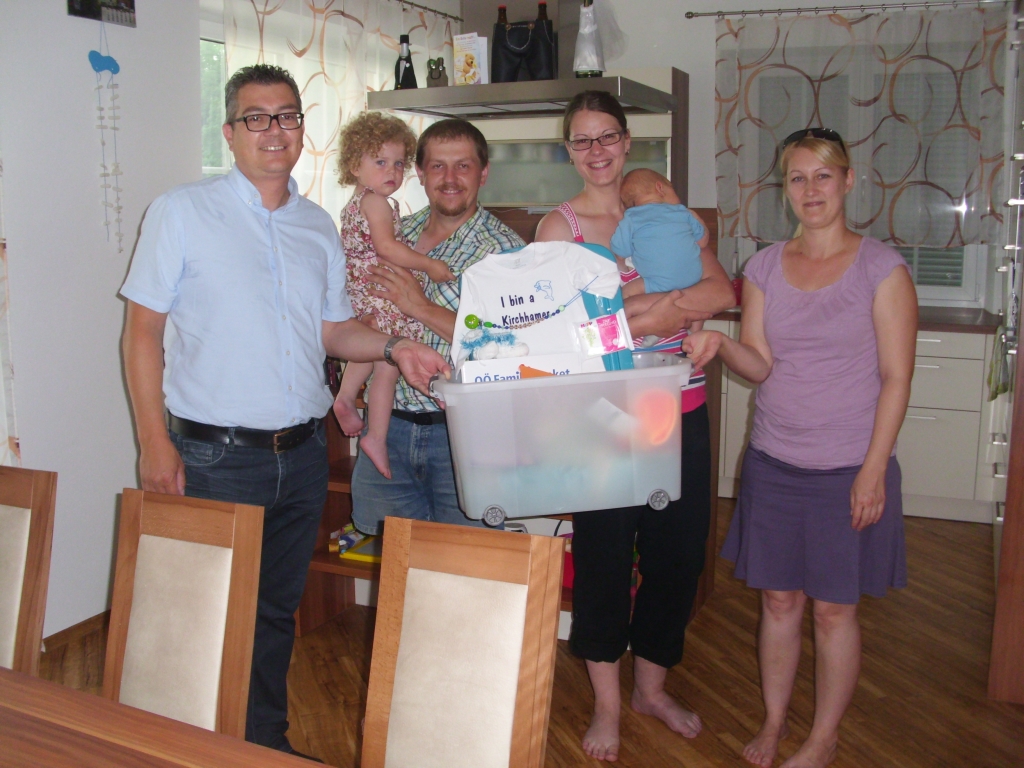 Den stolzen Eltern Maria und Gerhard Holzer, Steg 26, konnten Astrid Lüftinger und Bianca Fischer vom Team der Familienfreundlichen Gemeinde Kirchham sowie Sozialausschussobmann Ingo Dörflinger das „Kirchhamer Waisat“ für ihren Mitte Mai geborenen Sohn Matthias überbringen. Gleichzeitig überbrachten sie auch die besten Glückwünsche seitens der Gemeinde. Auch wir wünschen der jungen Familie alles Gute und Gottes Segen. |