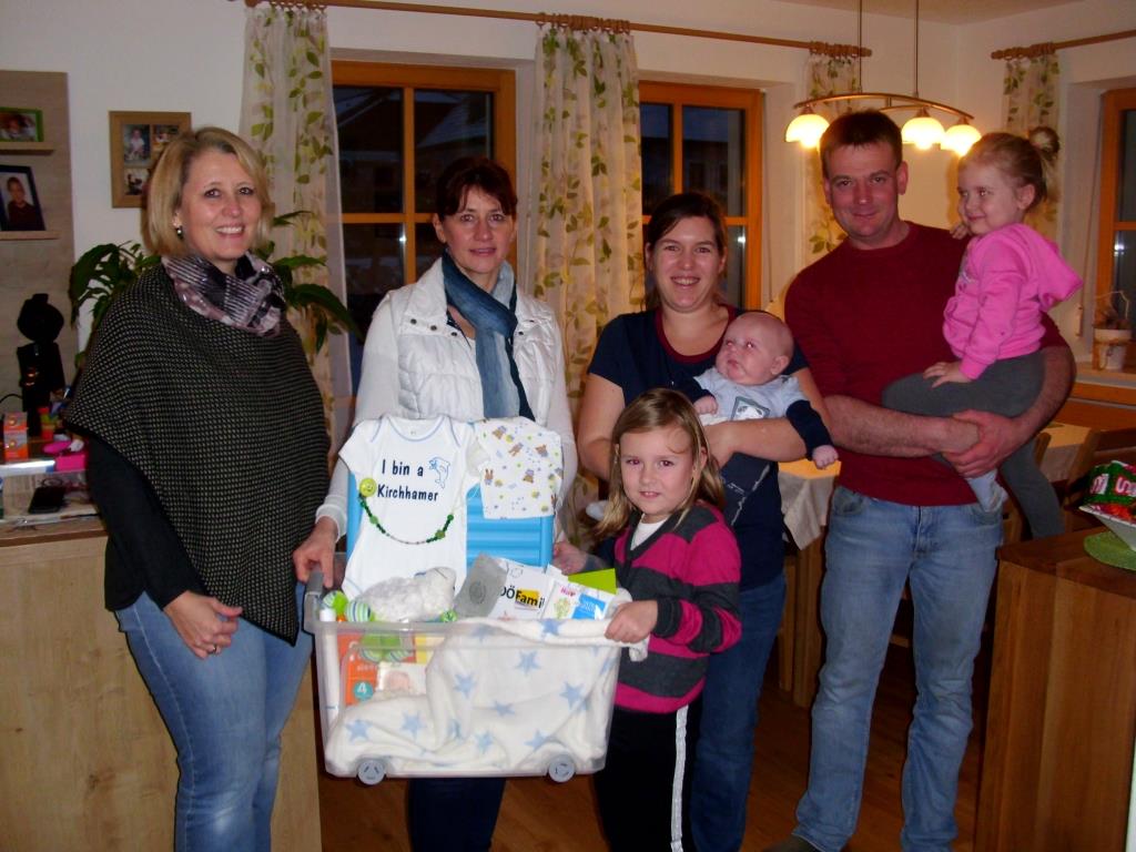 Mit einem Kirchhamer Waisat, zusammengestellt vom Führungsteam der Familienfreundlichen Gemeinde, konnten kürzlich Bianca Fischer, Gabi Pühringer und Astrid Lüftinger die Eltern Michael Holzinger u. Bettina Riedler, Wahl 23, überraschen. Anlässlich der Geburt von Matthias Mitte November überbrachten sie das liebevoll zusammengestellte Kirchhamer Waisat und die besten Glückwünsche seitens der Gemeinde. Auch die zwei großen Schwestern von Matthias freuten sich über den Besuch.
