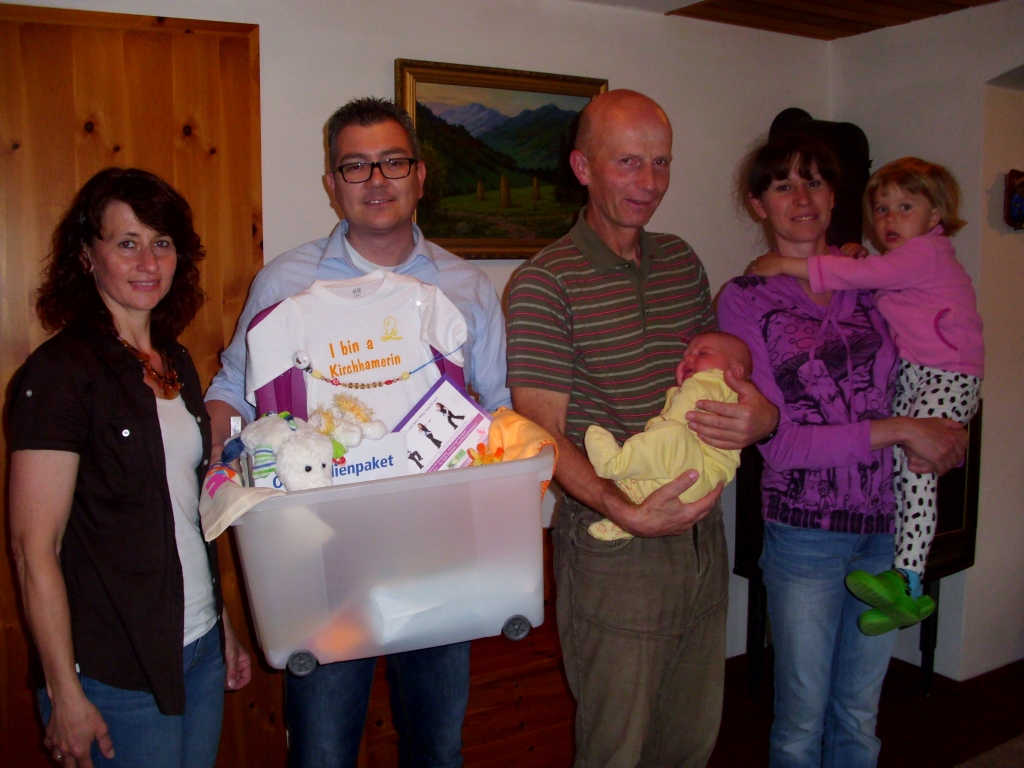 Unlängst war das Team der Familienfreundlichen Gemeinde mit Astrid Lüftinger und Gabi Pühringer sowie der Obmann des Sozialausschusses Ingo Dörflinger bei den jungen Eltern Anna und Josef Strasser, Kogl 36, um ihnen zu ihrer im März geborenen zweiten Tochter Natalie herzlichst zu gratulieren. Sie kamen dabei nicht mit leeren Händen – sie überbrachten neben den besten Glückwünschen auch seitens der Gemeinde das persönlich zusammengestellte Kirchhamer Waisat. Auch wir wünschen den Eltern alles Gute! |