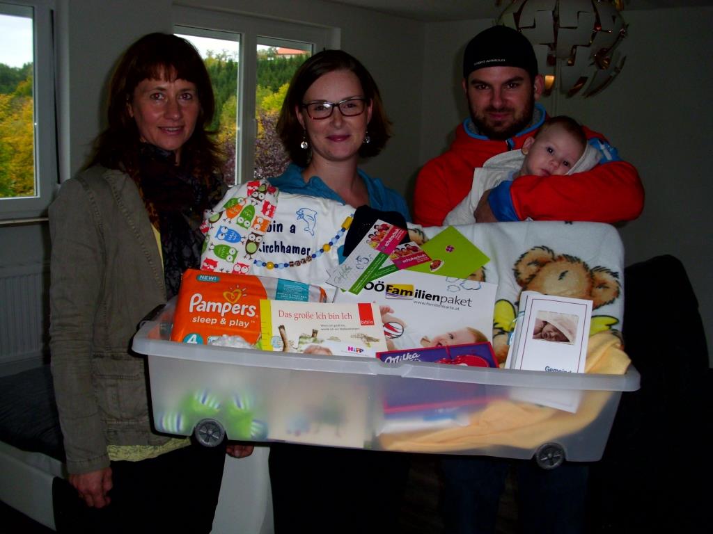 Mit großer Freude konnten das Team der Familienfreundlichen Gemeinde Kirchham wieder ein Kirchhamer Waisat überbringen. Gabi Pühringer und Astrid Lüftinger überraschten mit dieser persönlich zusammengestellten Aufmerksamkeit der Familienfreundlichen Gemeinde die glücklichen Eltern Melanie u. Dominik Klement , Wahl 5, und wünschten damit alles Gute auch seitens der Gemeinde für ihren Sohn Noah, der im Juli das Licht der Welt erblickte.