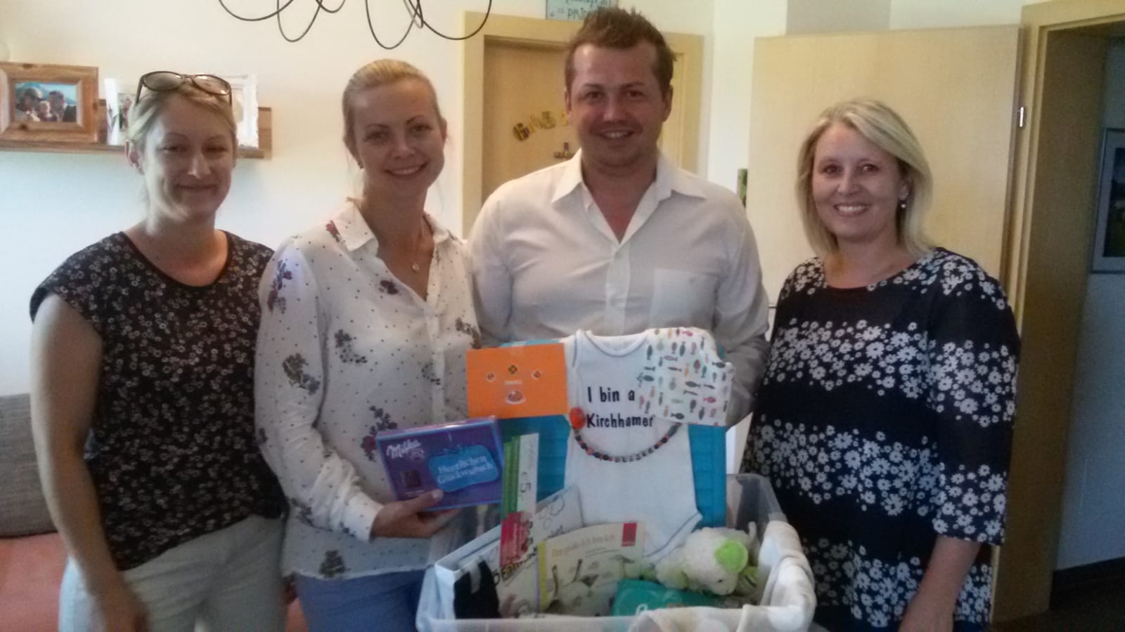 Mit großer Freude konnten das Team der Familienfreundlichen Gemeinde Kirchham wieder ein Kirchhamer Waisat überbringen. Gabi Pühringer, Bianca Haas und Astrid Lüftinger überraschten mit dieser persönlich zusammengestellten Aufmerksamkeit der Familienfreundlichen Gemeinde die glücklichen Eltern Svetlana u. Thomas Pöll, Florianiweg 4, und wünschten damit alles Gute auch seitens der Gemeinde für ihren Sohn Oliver, der Mitte März das Licht der Welt erblickte.