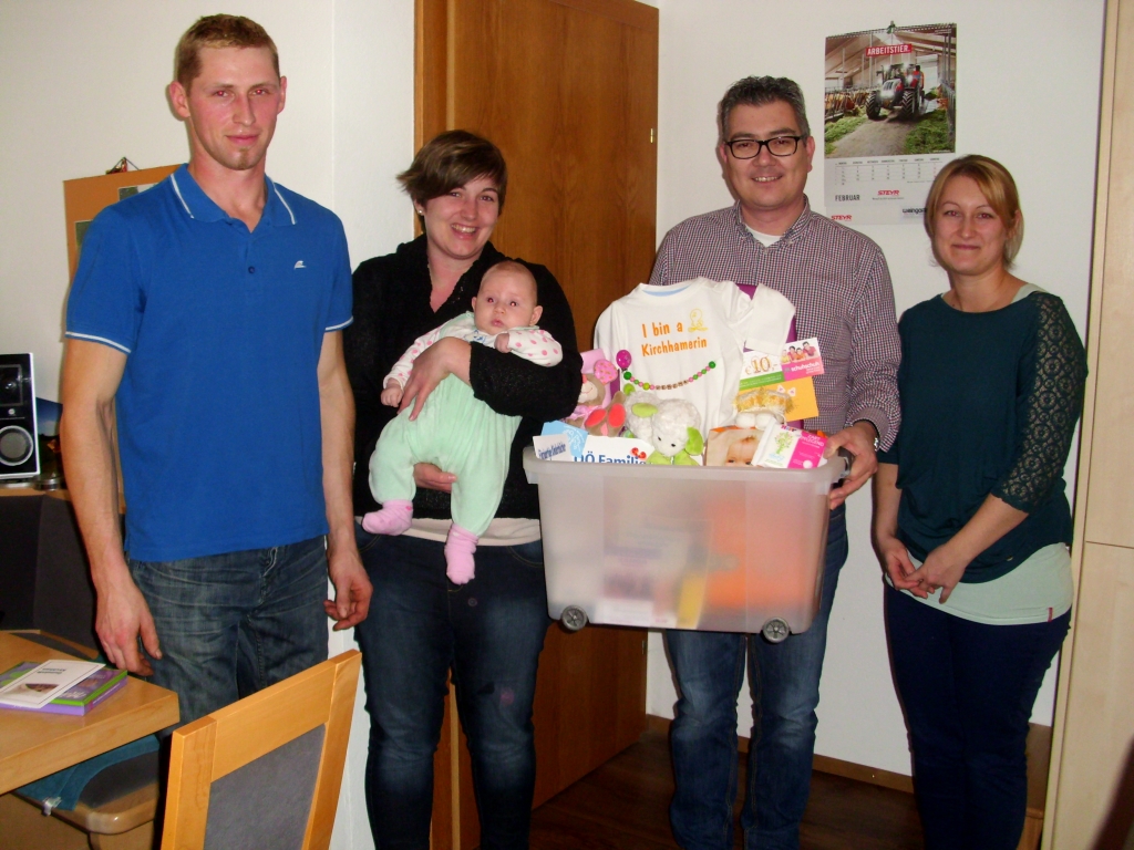 Vor kurzem waren Astrid Lüftinger und Bianca Fischer von der Familienfreundlichen Gemeinde gemeinsam mit dem Obmann des Sozialausschusses Ingo Dörflinger bei den jungen Eltern Katharina und Kurt Schlager, Hagenmühle 4, um ihnen zu ihrer Anfang November geborenen Tochter Verena herzlichst zu gratulieren. Als ganz persönliches Geschenk überreichten sie die liebevoll zusammengestellte Kirchhamer Geschenkbox. Auch die besten Glückwünsche seitens der Gemeinde überbrachten sie bei ihrem Besuch. Wir wünschen der jungen Familie ebenfalls alles Gute und Gottes Segen! |