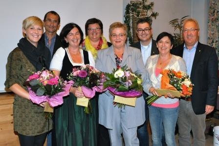 Foto oben – v.l.n.r.: Mag. (FH) Claudia Spitzbart, Dr. Burghard Ozlberger, Projektleiterinnen Manuela Brunnthaler-Moser und Gusti Klinglmair, Hermine Halbig, Sozialausschuss-Obmann Ingo Dörflinger, Andrea Eder und Bürgermeister Hans Kronberger.