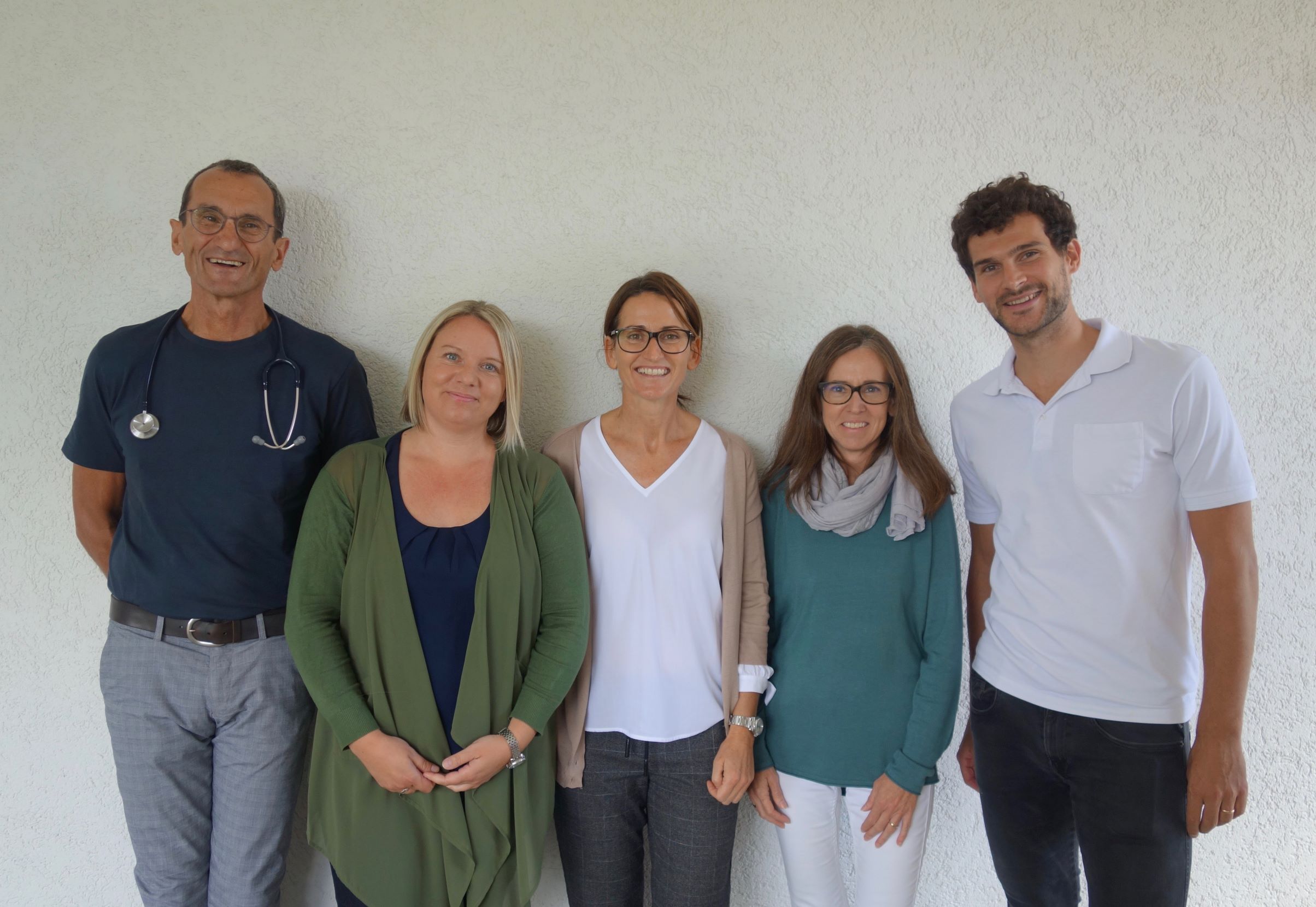 Foto (Laura Holzinger): Dr. Burghard Ozlberger (links) und Dr. Dominik Bammer (rechts) mit den drei Ordinationsassistentinnen Marion Viechtbaur, Gertrude Ozlberger und Maria Weinheimer (v. l. n. r.)