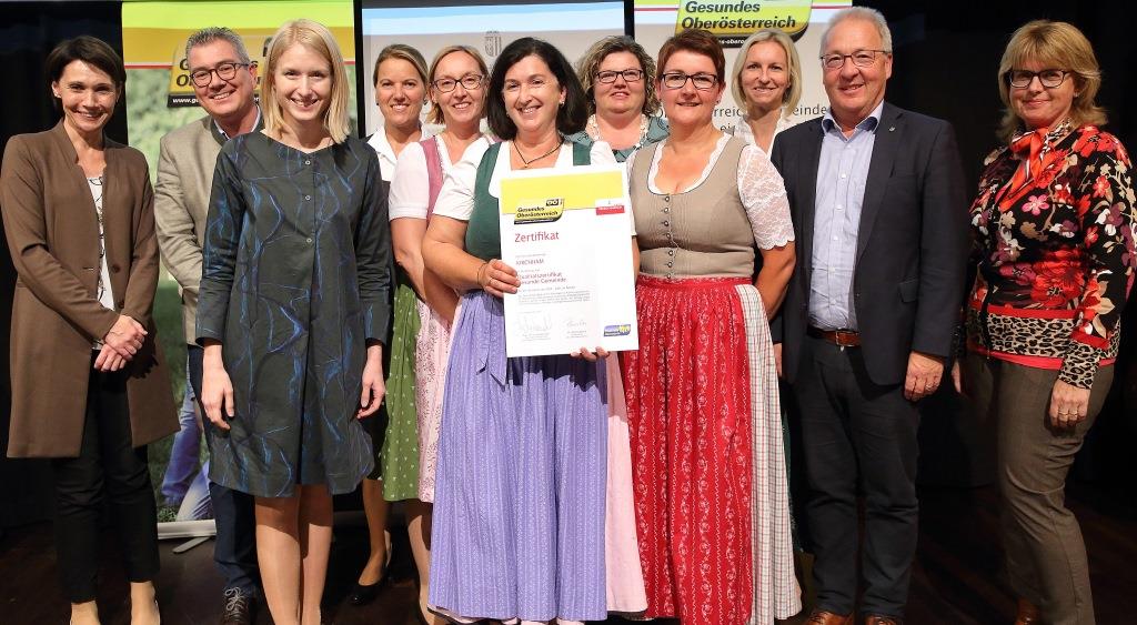 Bereits 1999 wurde die Projektgruppe „Gesunde Gemeinde“ in Kirchham von Andrea Eder und dem damaligen Vize- und heutigem Bürgermeister Hans Kronberger gegründet. Heuer feiert der profilierte Arbeitskreis das 20jährige Bestandsjubiläum mit einem Festabend am Freitag, 11. Oktober (19:30 Uhr, Gasthof Pöll). Neben einem heiteren Vortrag von Humorbotschafter Werner Gruber wird Arbeitskreisleiterin Manuela Brunnthaler-Moser eine kurze Rückschau halten, vor allem aber das neue Dreijahresprogramm „G’sund bleib’n auf Kirchhamerisch“ präsentieren. Achtwöchiges „Zeit-für-mich“ – Programm ab Jänner 2020 Als erster Aktivität im Rahmen dieses Programms wird eine „Zeit für mich“-Card angeboten, mittels der Männer und Frauen in der Lebensmitte an einem achtwöchigen Programm mit zahlreichen Übungseinheiten (Entspannung, Yoga, Kinesiologie, etc. ) teilnehmen können. Für dieses Programm wurde die Projektgruppe von LH-Stellvertreterin Christine Haberlander mit dem Qualitätszertifikat des „Netzwerkes Gesundes Oberösterreich“ ausgezeichnet. Die Verleihung erfolgte unlängst bei der Regionalkonferenz in Ohlsdorf, bei der Manuela Brunnthaler-Moser auch für ihre fünfjährige Leitungstätigkeit eine besondere Ehrung erhielt. Foto: Land OÖ | Text: Johann Kronberger