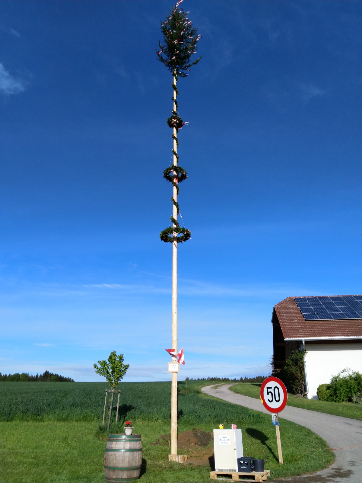 Auch in Kampesberg ziert nun ein mehr als 20 Meter hoher Maibaum die Zufahrt zur Familie Pühringer („Groß-Kolmberg“). Die Familienmitglieder, die sonst immer alle aktiv beim Maibaumaufstellen des Trachtenvereins mithalfen, banden kurzerhand drei Ringe und einen Wendelkranz aus Tannenreisig, schmückten den Baum und wollen somit auch in dieser schwierigen Zeit das Brauchtum des Maibaumaufstellens pflegen.