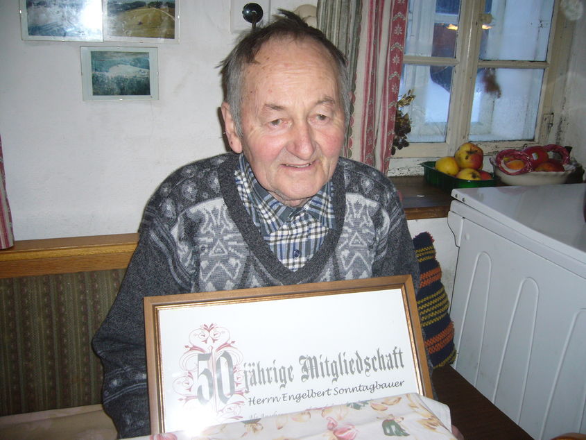 Bauernbundobmann Anton Pühringer und Sprengelbetreuer Johann Oberndorfer überbrachten Herrn Engelbert Sonntagbauer, Edtbauer; die Ehrenurkunde für 50 jährige Mitgliedschaft beim Bauernbund.