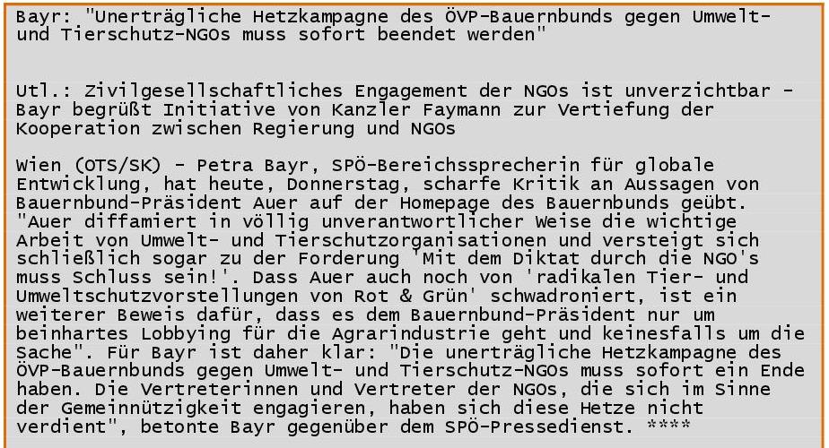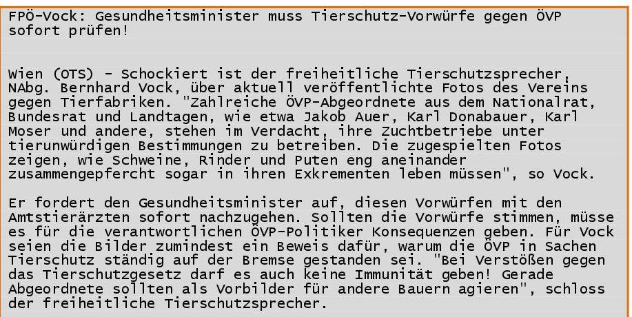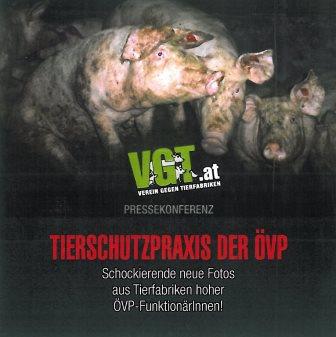 Im Graubereich der Illegalität verbreitet die Grün-nahe radikale Tierschützergruppierung VGT (Verein gegen Tierfabriken) seit letzter Woche illegal aufgenommene sowie manipulierte Fotos aus Stallungen von Bauernbund Funktionären