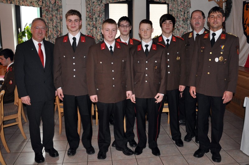 Die neuen FF-Mitglieder nach der Angelobung durch Bgm. Kronberger:  Thomas Pflügl, Lukas Stadlhuber, Bernhard Loitelsberger, Thomas Stöttinger, Andreas Hutterer, Bezirkskdt. Robert Benda und FFK-Kdt. Gerhard Hutterer.