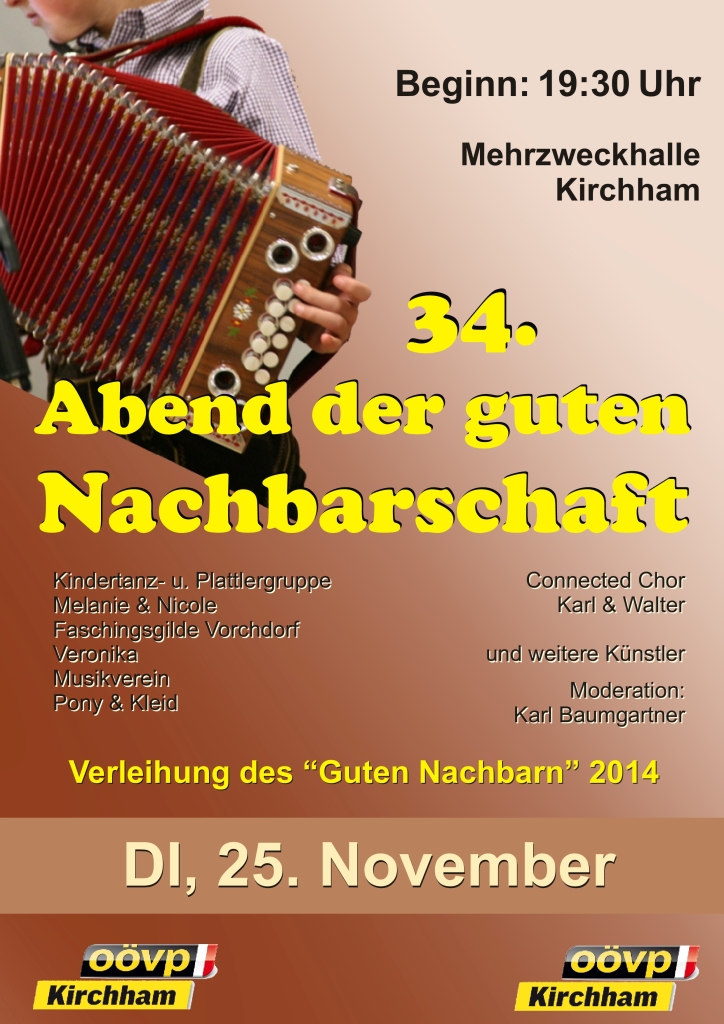 Bereits zum 34. Mal in Folge lädt die ÖVP-Ortsgruppe Kirchham am Dienstag, 25. November ("Kathrein-Tag") zum traditionellen Nachbarschaftsabend. Zahlreiche Hobby- und Nachwuchskünstler aus Kirchham und den Nachbargemeinden bieten einen bunten Strauß an Unterhaltung für Alt und Jung.