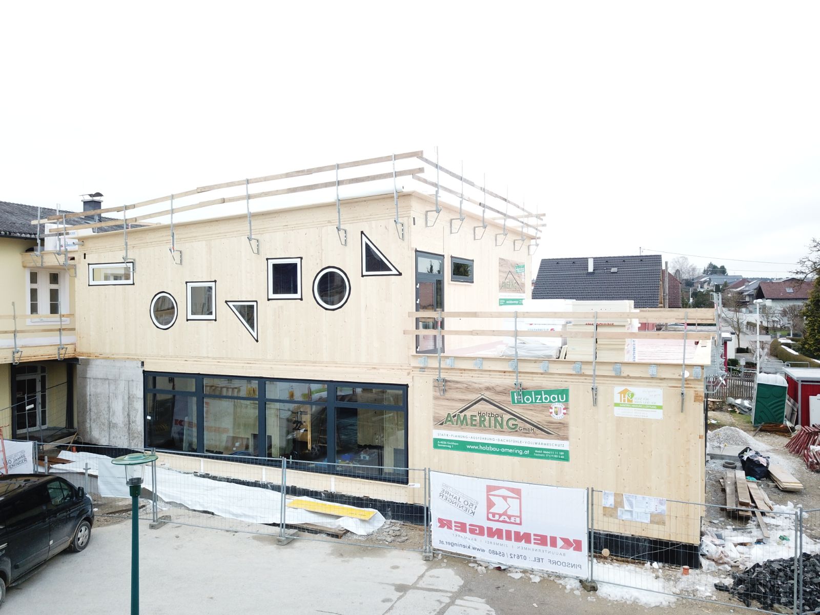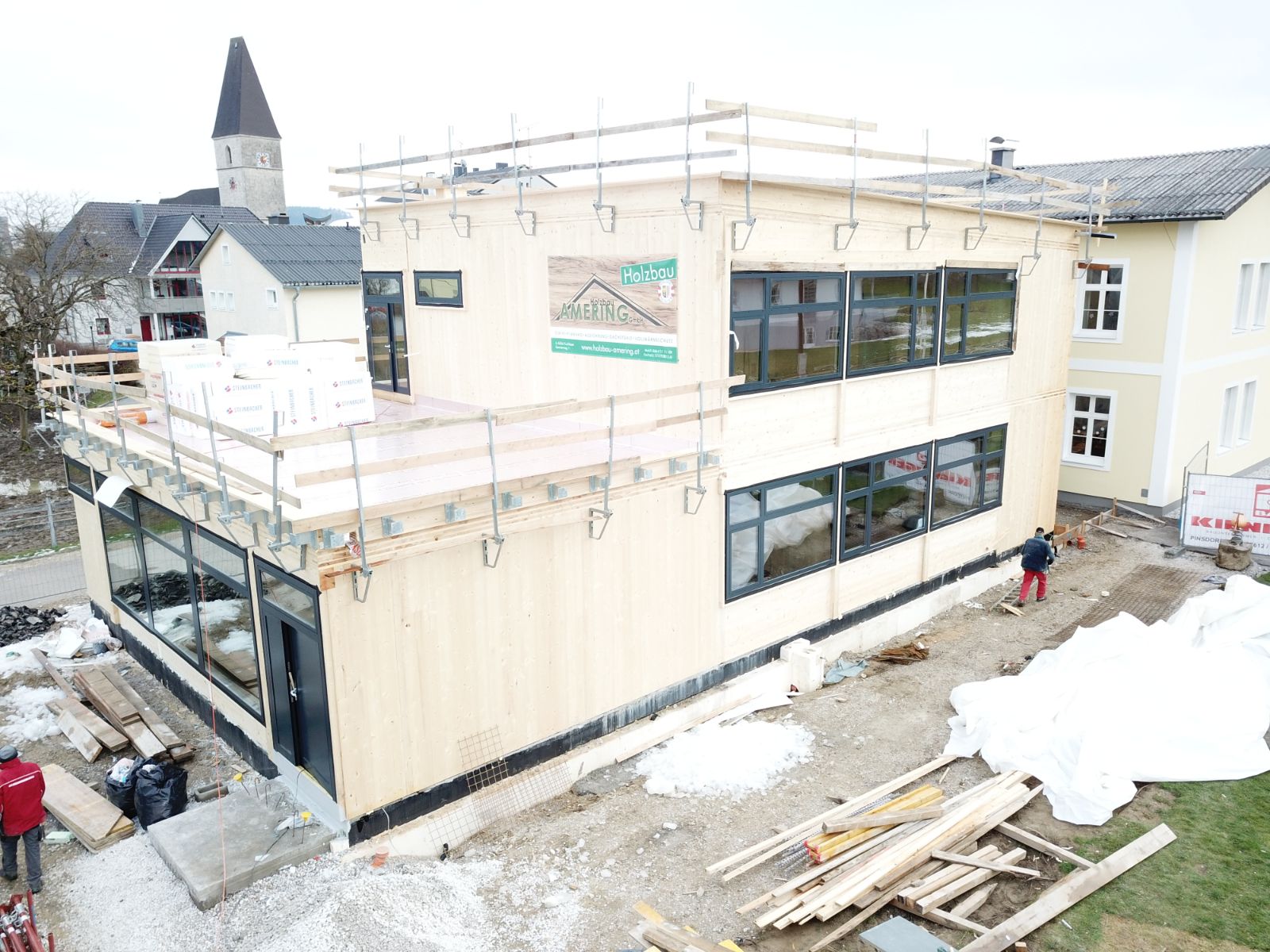 "Mit diesem Investitionsvolumen sind wir auch ein bedeutender Wirtschaftsfaktor ist, fließen doch die knapp 2 Millionen Euro direkt als Aufträge an Dienstleistungs- und Gewerbebetriebe. Wir achten bei den Ausschreibungen auch sehr darauf, dass die Wertschöpfung bei Firmen in der Region bleibt", freut sich Bürgermeister Kronberger darüber, dass sämtliche Arbeiten beim Kindergartenprojekt an Betriebe aus dem nördlichen Bezirk Gmunden vergeben werden konnten. Fotos (Gemeinde Kirchham): Der Rohbau des Kindergarten-Zubaus in Kirchham steht bereits, finanziert und eröffnet wird im neuen Jahr 2018. |