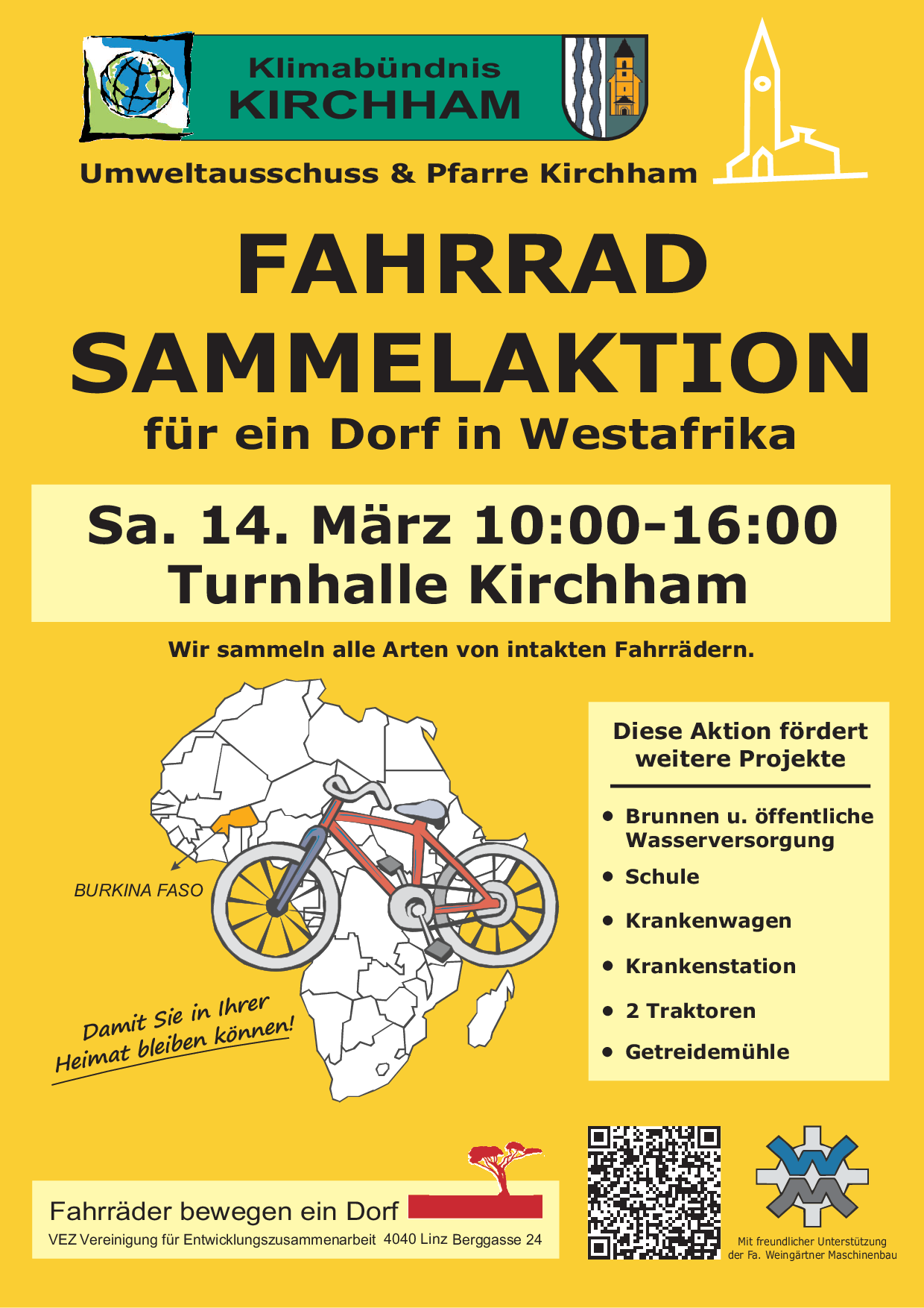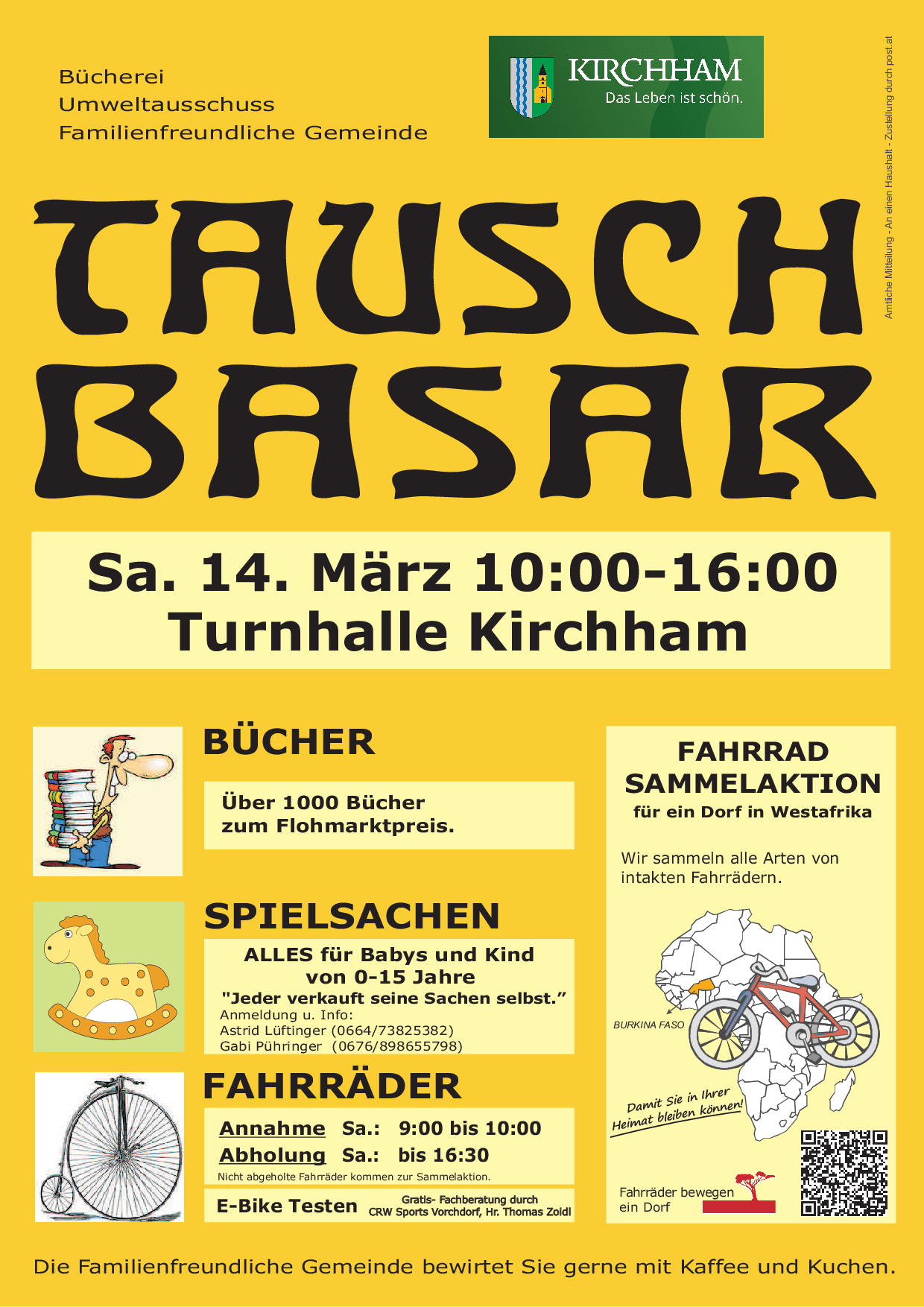 Die Turn-und Mehrzweckhalle Kirchham wird am Samstag, 14. März 2015 zum Basar verwandelt. Das Bücherei-Team, die Familienfreundliche Gemeinde sowie der Umweltausschuss organisieren von 10 bis 16 Uhr einen Flohmarkt für Bücher (1000 Bücher sind aufgelegt!), für Spielsachen für Kids von 0 bis 15 Jahre sowie für Fahrräder. Zudem werden unter dem Motto "Fahrräder bewegen ein Dorf" Fahrräder für ein Dorf in Burkina Faso gesammelt, um die Mobilität und damit die Eigenständigkeit der Menschen in Westafrika zu verbessern. Jedes Fahrrad (ausgenommen Kinderräder) wird dafür angenommen und in Zusammenarbeit mit der VEZ (=Vereinigung für Entwicklungszusammenarbeit Linz) zum Bestimmungsort in Westafrika gebracht. Am Turnhallenvorplatz gibt es die Möglichkeit E-Bikes zu testen, im Foyer wird Kaffee und Kuchen angeboten. Nähere Infos am Gemeindeamt Kirchham (Frau Kronberger Tel.: 07619/2015-33 und Stefan Söllner, Tel.: 0650/7909988). |