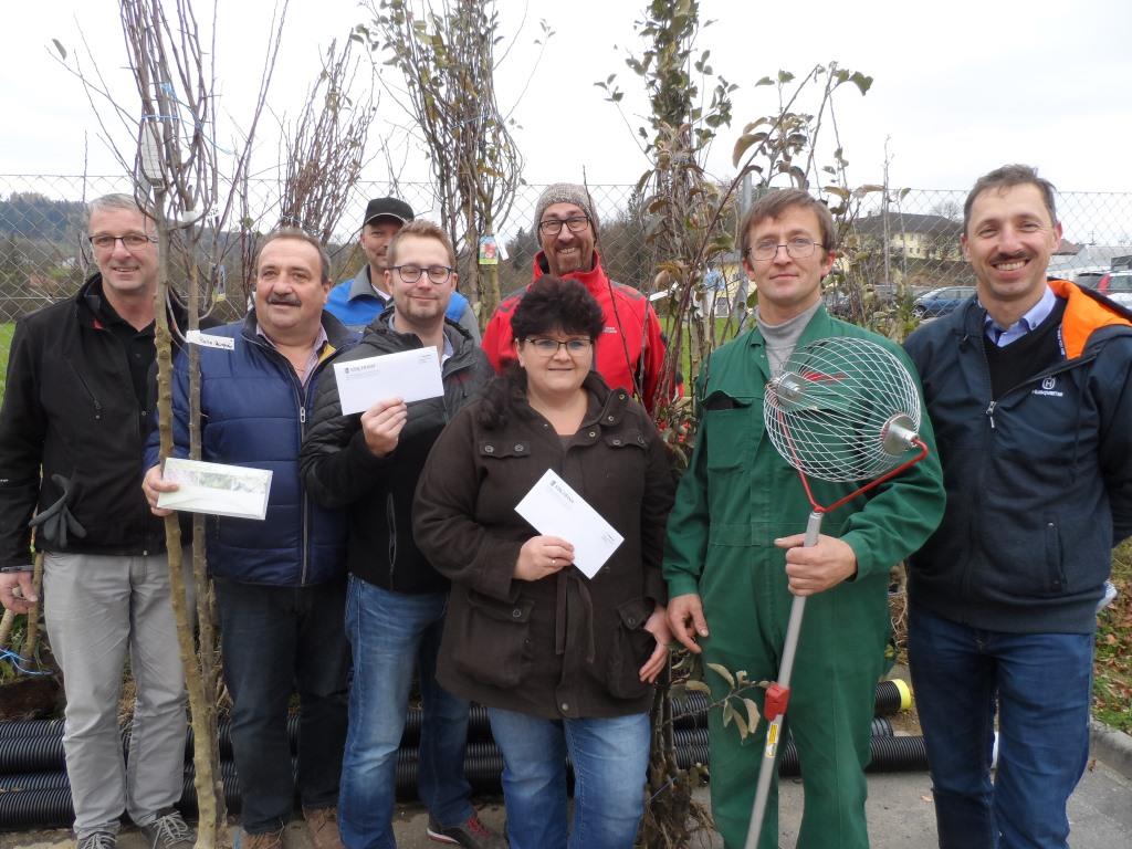 Aus Anlass des 1.000sten verkauften Baumes wurde die Aktion mit einem Gewinnspiel bereichert. Den vom Lagerhaus Laakirchen zur Verfügung gestellten Hauptpreis,einen "Rollblitz" zum Apfelklauben, gewann Franz Mayrhofer ("Asanger"), Einkaufsgutscheine der Baumschule Weber wie der Gemeinde gingen an Gertraud Heidekum, Alfred Platzer-Reingruber, Michael Plank und Alois Jungwirth. Foto (Gemeinde Kirchham): Die Preisträger beim heurigen Gewinnspiel der Kirchhamer Obstbaumaktion und den Organisatoren Umweltausschuss-Obmann Stephan Söllner (ganz links) und Vizebürgermeister Anton Pühringer (ganz rechts).