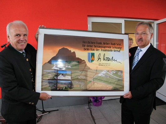 Bürgermeister Hans Kronberger dankte dafür seinen „Bauleitern“ Union-Präsident Rudi Seyr und Fußballsektionsleiter Ing. Manfred Hochreiter und berichtete, dass trotz der angefallenen Zusatzkosten für einen aus Sicherheitsgründen errichteten Gehweg zur Sportstätte, der genehmigte Finanzierungsplan eingehalten wird. Von der Qualität der Anlage als auch von der enormen Eigenleistung zeigte sich selbst der anwesende Landesrat Dr. Josef Stockinger schwer beeindruckt („Das gibt’s sonst nirgends!“). Als Kirchhams Ortsoberhaupt in seiner Ansprache den Wunsch äußerte, dass ihm neben dem grünen Rasen und dem roten Klubheim noch etwas Schwarzes fehle, bekam er vom Gemeindereferenten unter großem Beifall der zahlreichen Festgäste spontan die Zusage, den noch nicht befestigten Vorplatz asphaltieren zu dürfen.