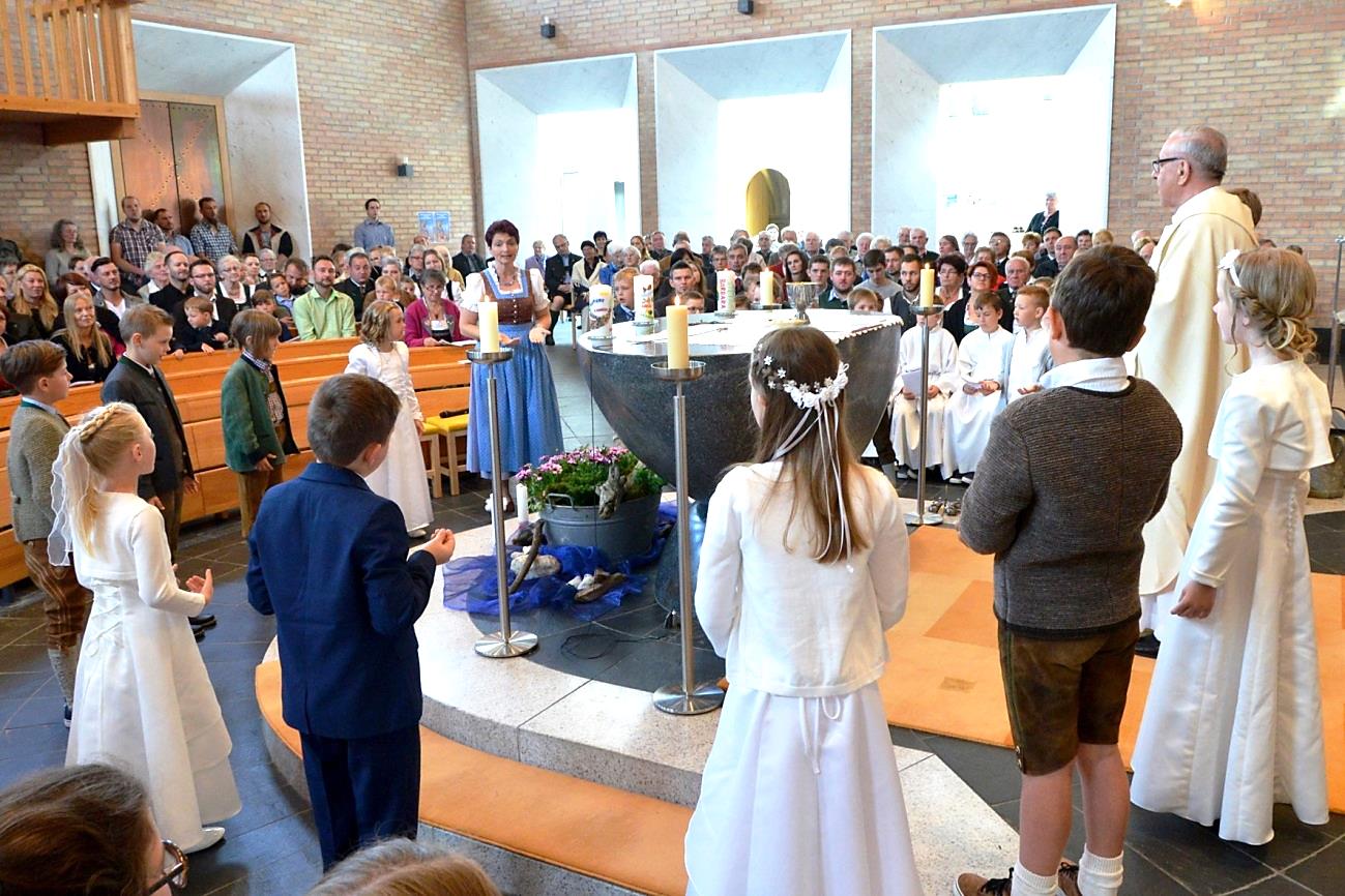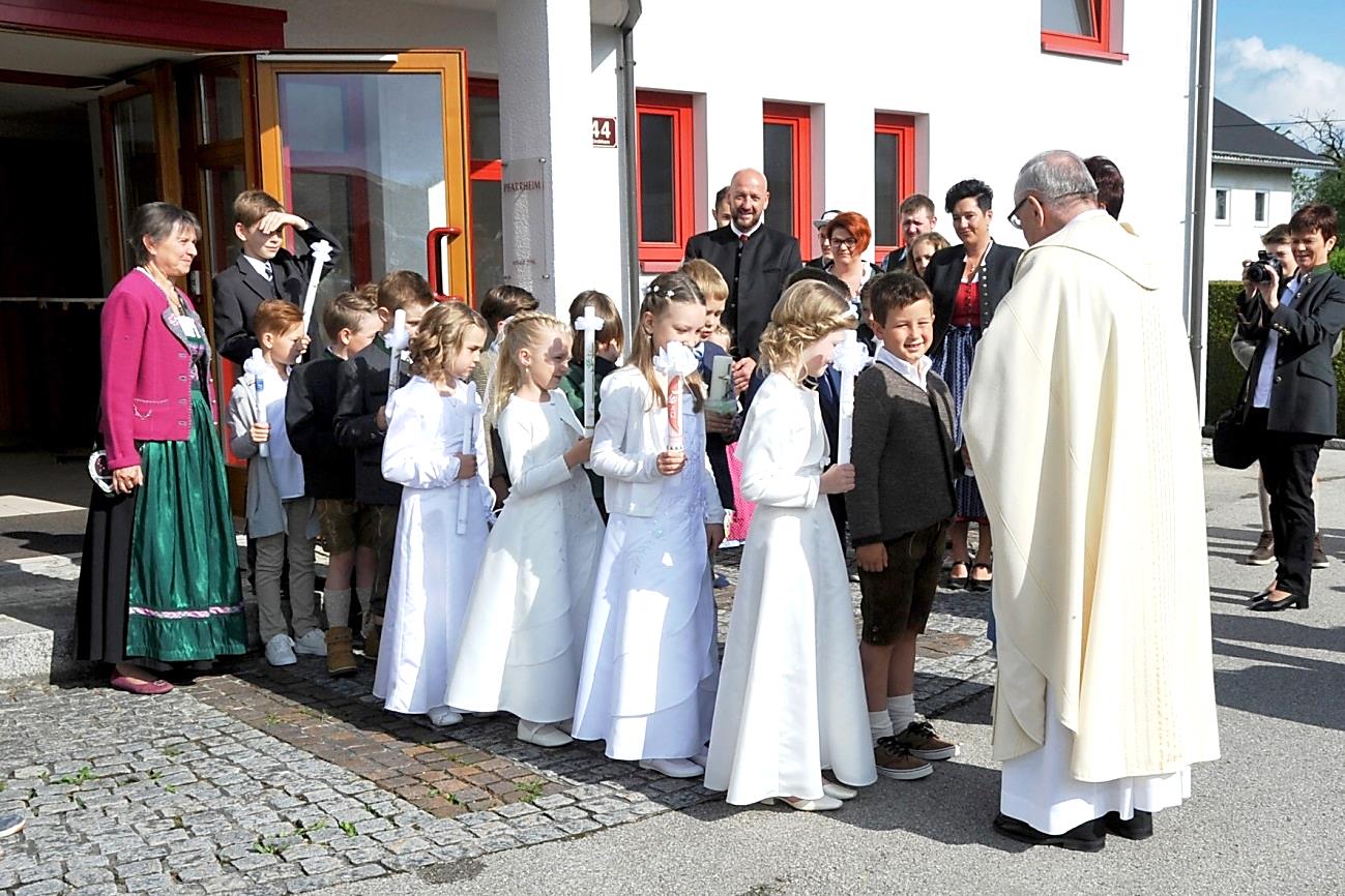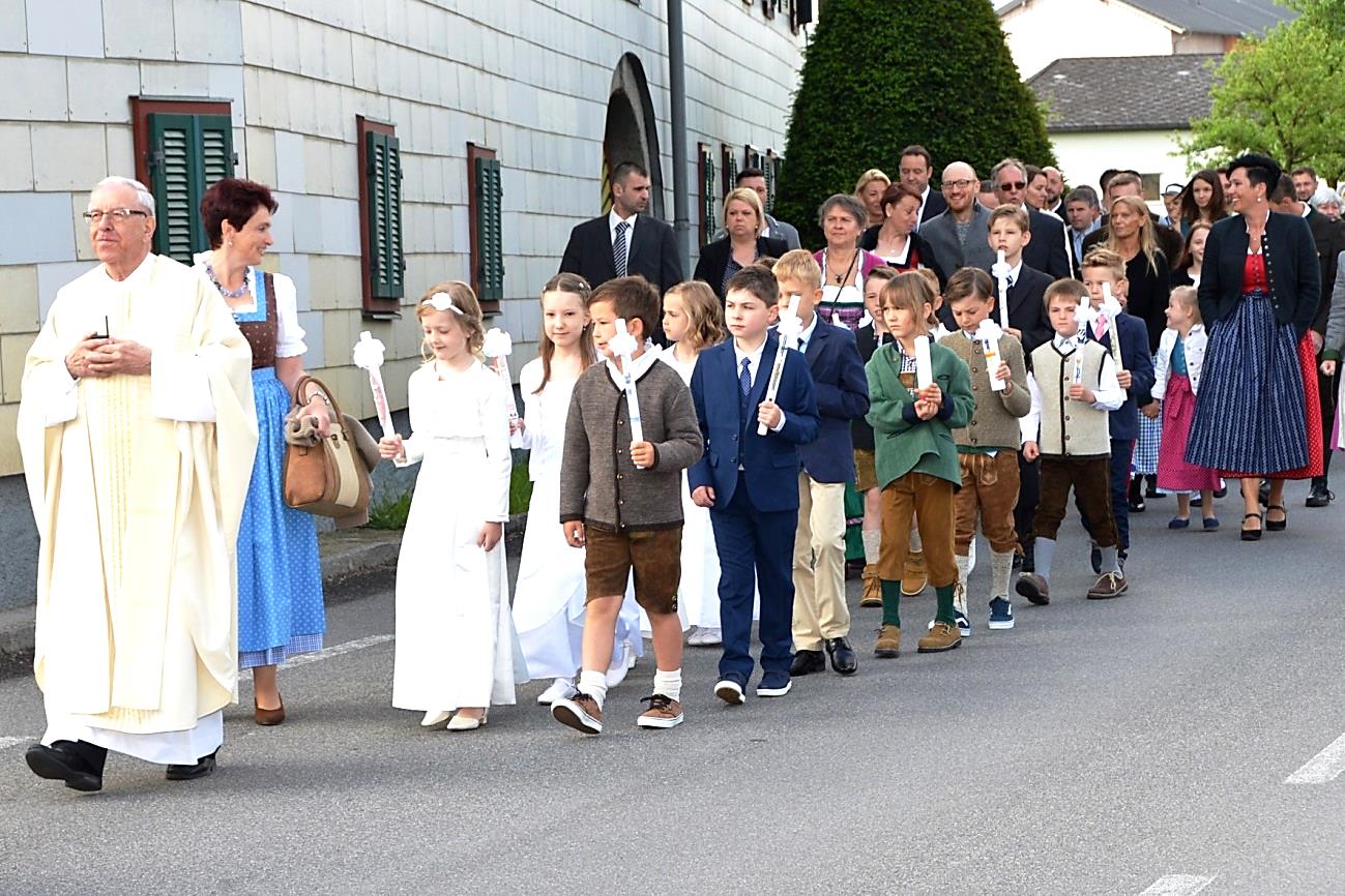 Bei der anschließenden Stärkung im Pfarrheim erhielt jedes Erstkommunionkind eine zum Thema passende, von der Frauenbewegung in Handarbeit liebevoll gefertigte, Erinnerungskerze mit Kerzenständer. Bei der Maiprozession zur Leitingerkapelle wurde nach der Segnung jedes einzelnen Kindes das Pfarrgeschenk, ein von der Firma SFK Spitzbart hergestelltes Kreuz, übergeben. Ebenso ein herzliches Vergelt’s Gott an die Tischmuttis für ihren liebevollen Einsatz und an alle Helfer und Beteiligten, die zum Gelingen dieses würdigen Festes beigetragen haben.