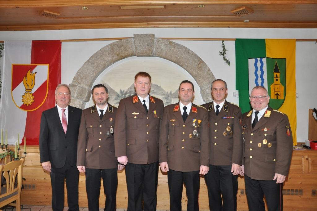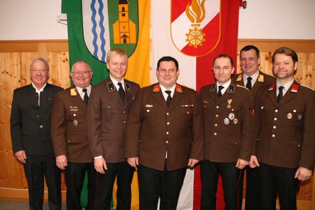 v.l.n.r.: Bürgermeister Hans Kronberger, Abschnittskdt. Christian Huemer, Florian Stöhr, Wolfgang Nußbaumer, Gerhard Lehner, Bezirkskdt. Stefan Schiendorfer und Thomas Preinstorfer.