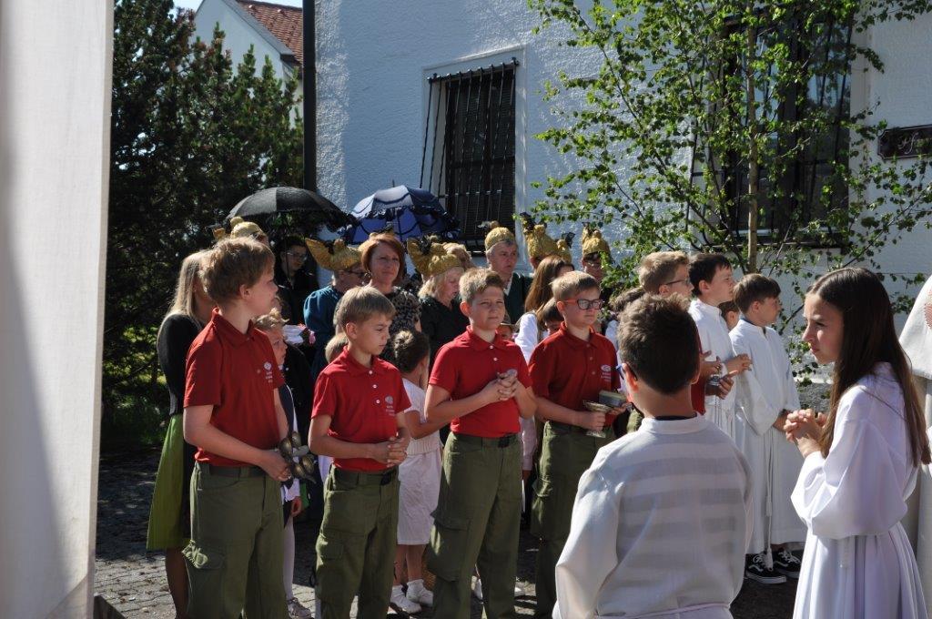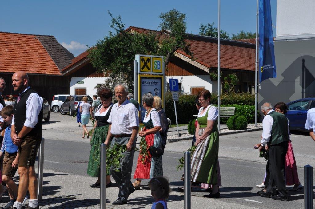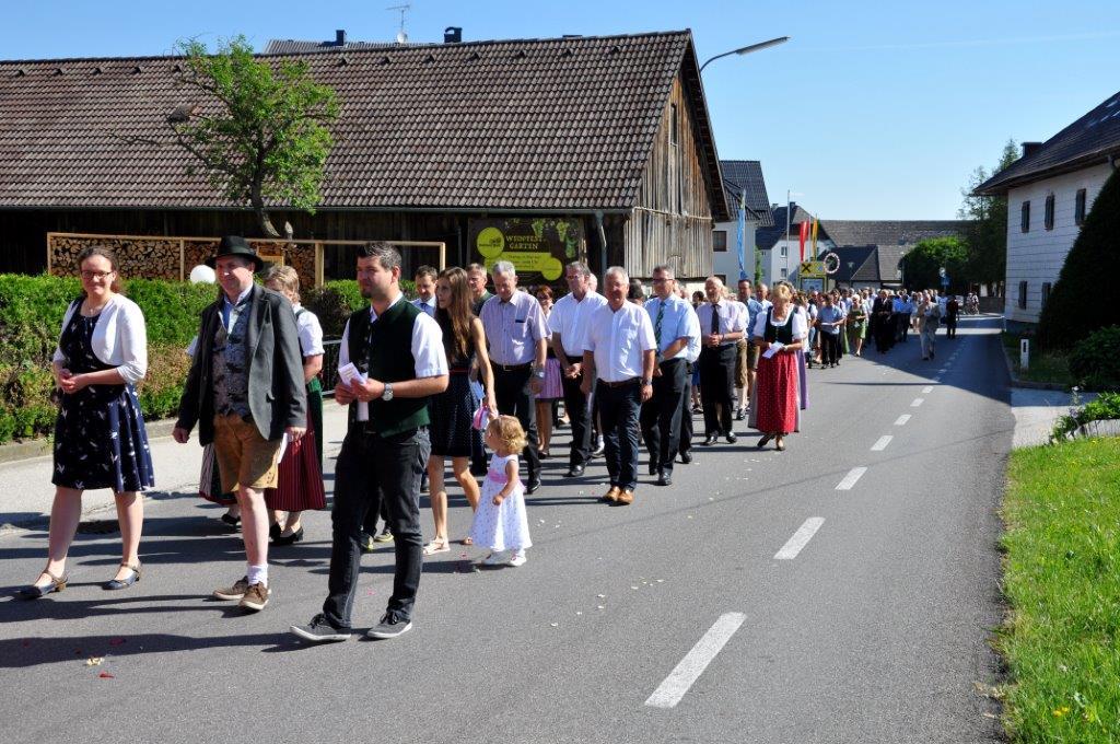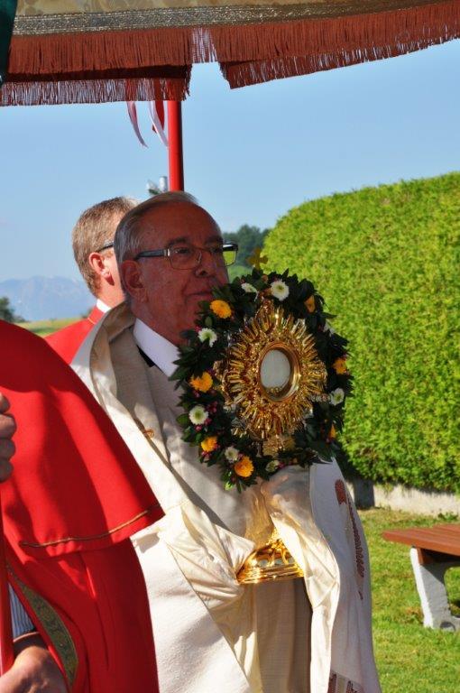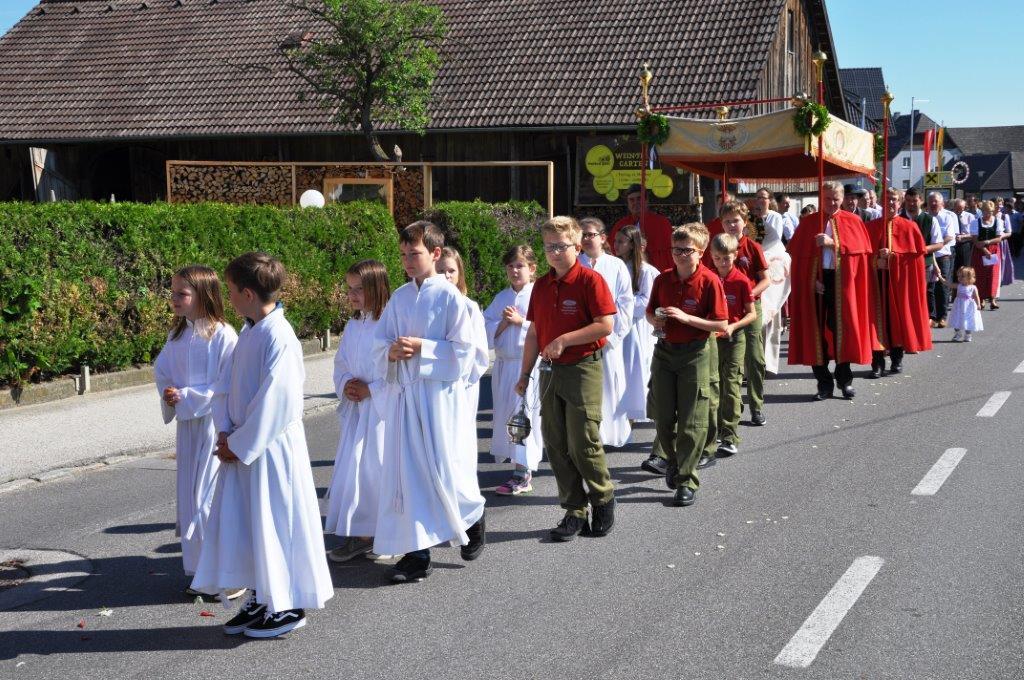 Neben den zahlreichen Vereinen verschönerten die zahlreichen Goldhaubenfrauen sowie die Erstkommunionkinder mit ihrer Beteiligung den Festzug. Bei den 4 wunderschön vorbereiteten Segensstationen las Pfarrer P. Burkhard, der von einer großen Ministrantenschar begleitet wurde, jeweils eine andere Stelle des Evangeliums gemeinsam mit den Fürbitten und erbat von Gott den Segen für uns, unsere Arbeit und die Kirche.