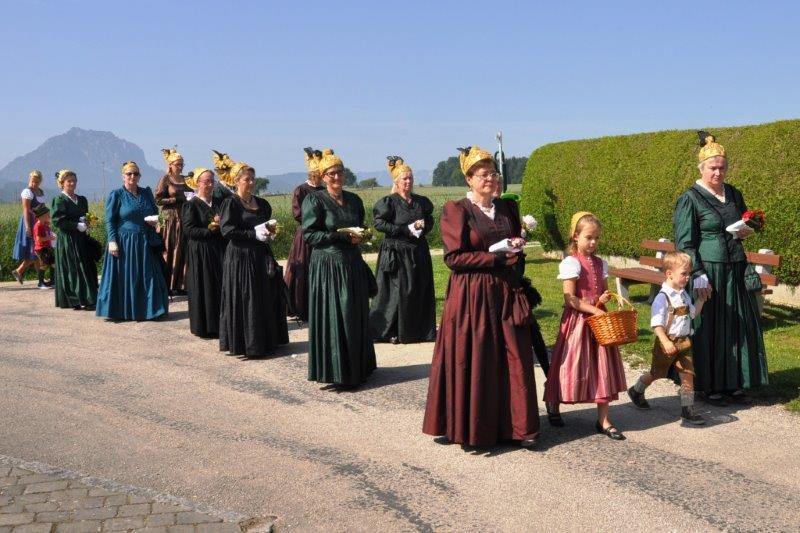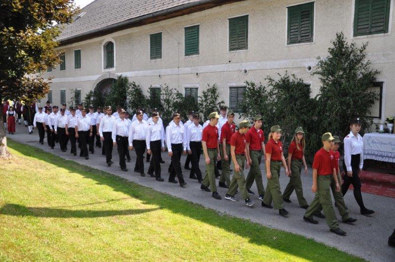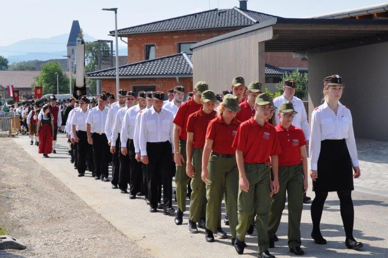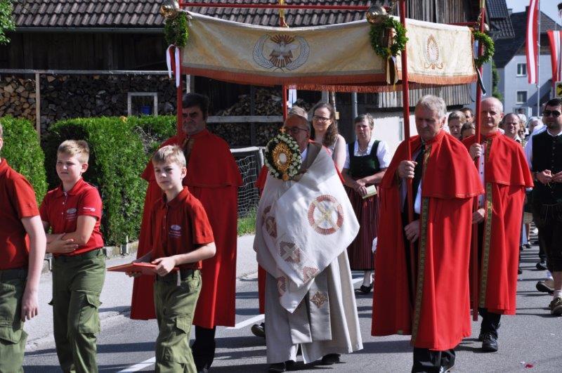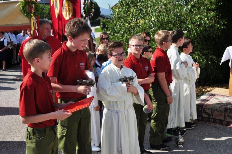 Neben den zahlreichen Vereinen verschönerten die zahlreichen Goldhaubenfrauen sowie die Erstkommunionkinder mit ihrer Beteiligung den Festzug. Bei den 4 wunderschön vorbereiteten Segensstationen las Pfarrer P. Burkhard, der von einer großen Ministrantenschar begleitet wurde, jeweils eine andere Stelle des Evangeliums gemeinsam mit den Fürbitten und erbat von Gott den Segen für uns, unsere Arbeit und die Kirche.