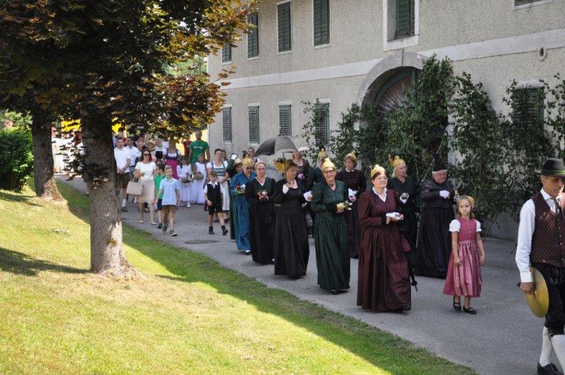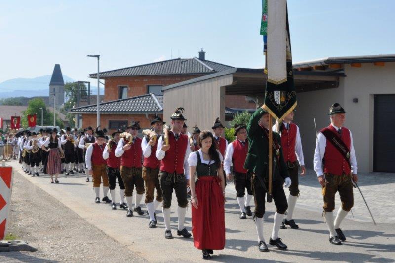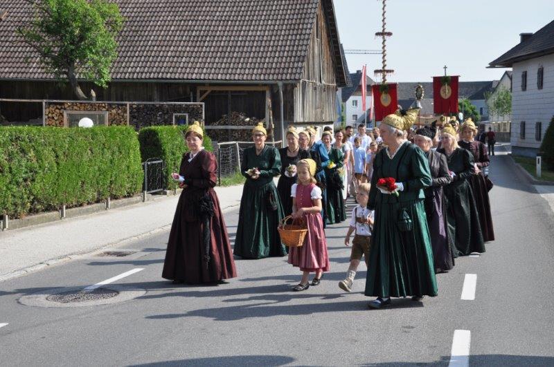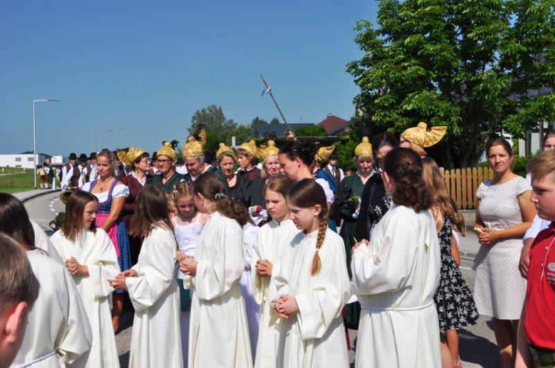 Neben den zahlreichen Vereinen verschönerten die zahlreichen Goldhaubenfrauen sowie die Erstkommunionkinder mit ihrer Beteiligung den Festzug. Bei den 4 wunderschön vorbereiteten Segensstationen las Pfarrer P. Burkhard, der von einer großen Ministrantenschar begleitet wurde, jeweils eine andere Stelle des Evangeliums gemeinsam mit den Fürbitten und erbat von Gott den Segen für uns, unsere Arbeit und die Kirche.