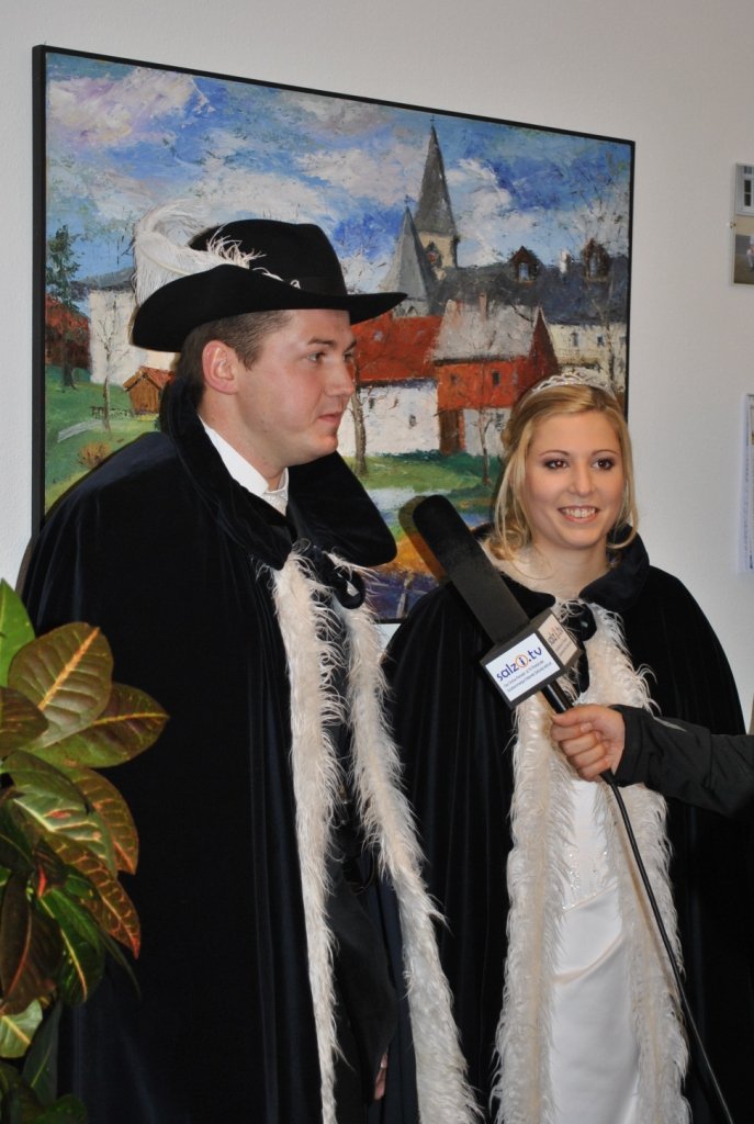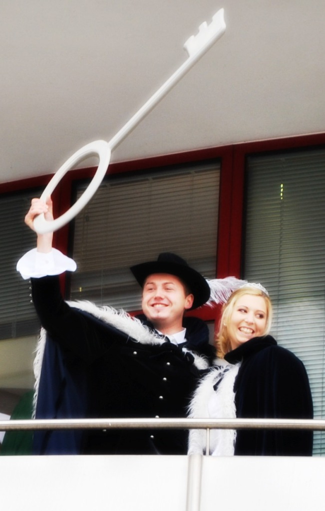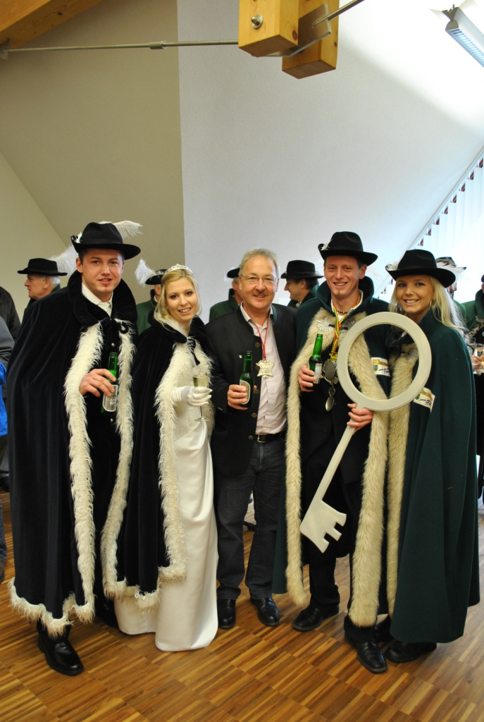 Foto (Gemeinde Kirchham) : Die neue Regenschaft in Kirchham nach der gelungenen Machtübernahme mit dem  Schlüssel des Gemeindeamtes v.l.n.r.: Prinz Thomas I., Prinzessin Sarah, Bürgermeister Hans Kronberger, Faschingspräsident Joschi Eder mit seiner Judith.