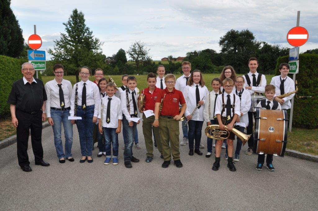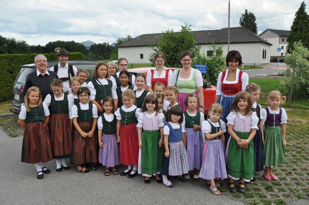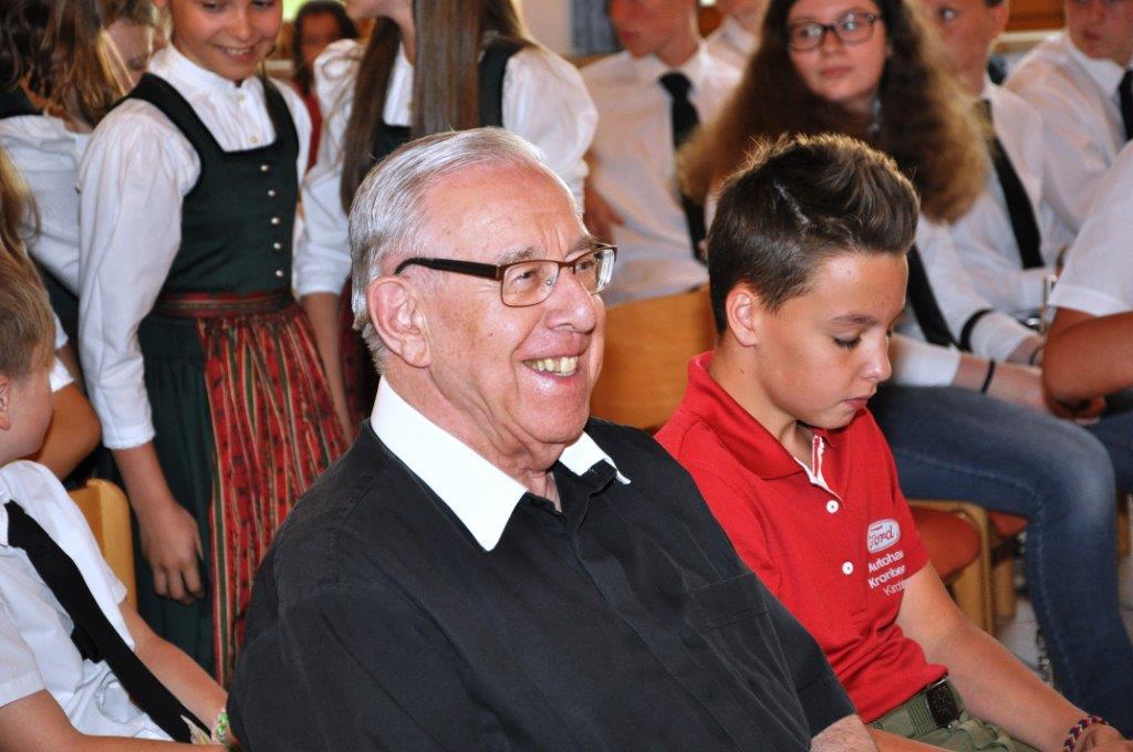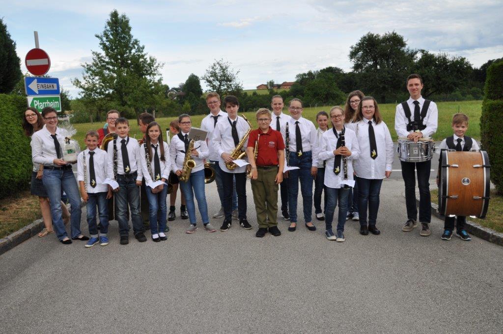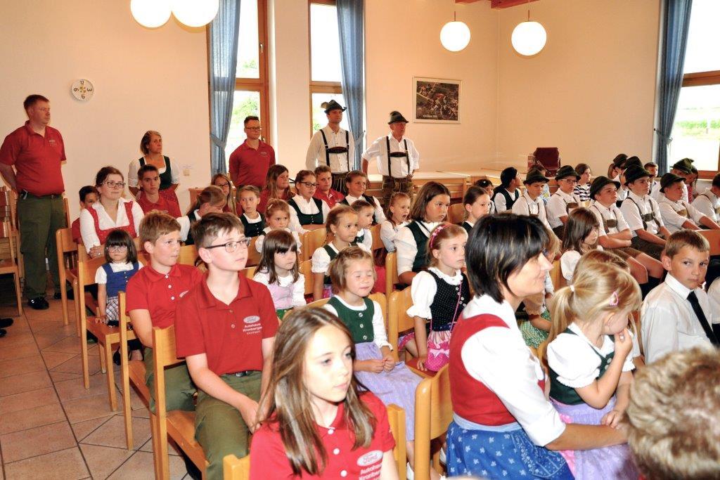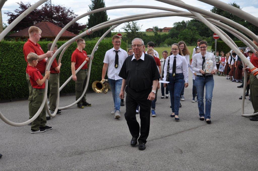 Eine ganz besondere Feier durften am Freitag, 30. Juni viele Kinder unserer Vereine erleben. Da unserem Herrn Pfarrer die Kinderarbeit in den Vereinen sehr wichtig ist und diese schätzt, lud er anlässlich seines goldenen Priesterjubilläums die Jungmusiker „Churchham Bananas“, die Feuerwehrjugend, die Kindertanz- und -plattlergruppe des Trachtenvereins sowie die vielen Minstranten zu einer kleinen persönlichen Feier ins Pfarrheim ein. Nach dem Empfang bei herrlichem Wetter vor dem Pfarrheim gabs einen würdigen Einzug durch ein „Schlauchspalier“ der Feuerwehrjugend. Im Saal des Pfarrheims begann die Feier mit einem Musikstück, gefolgt von den Tänzen der Kindertanzgruppe und der Plattlerjugend sowie den Glückwünschen der Feuerwehrjugend und den Ministrantinnen und Ministranten. Viele der über 80 Kinder waren gleich in mehreren Funktionen tätig und einer schaffte sogar die Beteiligung in allen 4 Gruppen!
