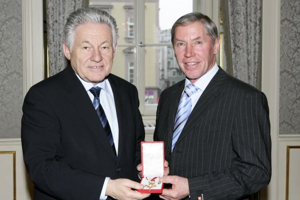 Foto (Land Oberösterreich): LH Dr. Josef Pühringer überreicht an Bürgermeister aD Franz Bieregger das Goldene Verdienstzeichen der Republik Österreich!