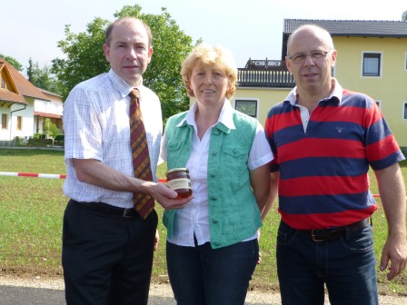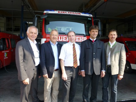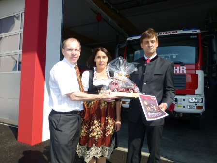 Vorbildliche Zusammenarbeit bei FF-Haus-Neubau Beeindruckt von der Gastfreundschaft und dem enormen Fachwissen der heimischen „Bienenväter“ verabschiedete sich der Landesrat, um das erst kürzlich eröffnete neue Feuerwehrhaus zu besichtigen. Kommandant Gerhard Hutterer und Bürgermeister Hans Kronberger führten den Gemeindereferenten, der den Bau mit 560.000 Euro wesentlich mitfinanziert hat, durch die moderne Einsatzzentrale der FF Kirchham. Sichtlich angetan von den Schilderungen des Kommandanten bezeichnete Hiegelsberger die ausgezeichnete Zusammenarbeit wie die Qualität des Hauses als „wirklich vorbildhaft und beispielgebend!“ Als Dank für seine Unterstützung erhielt Landesrat Hiegelsberger von Kommandant Gerhard Hutterer und seiner Gattin ein symbolisches „Tanklöschauto“ überreicht.