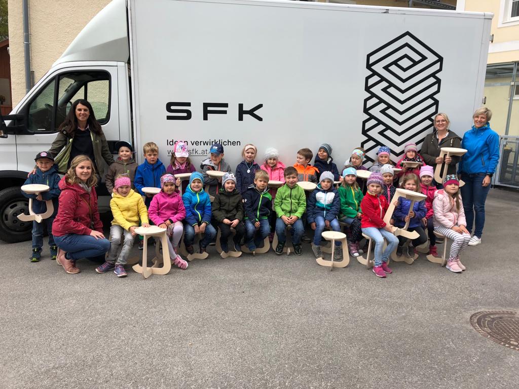 Alle 26 Kinder erhielten als überaus großzügiges Geschenk den Hocker von der Firma SFK zum Kindergarten geliefert und durften diesen als Erinnerung an diesen tollen Ausflug mit nach Hause nehmen. Wir bedanken uns sehr herzlich für die Einladung bei Fr. Claudia Haslinger!