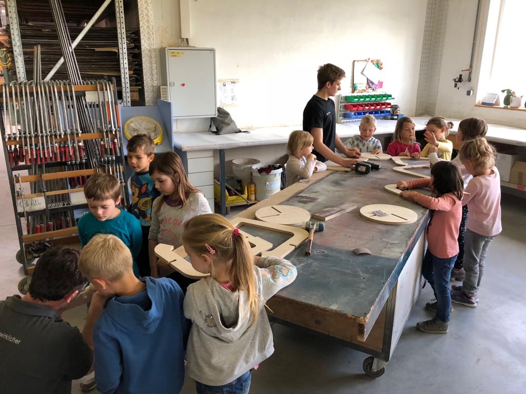 Die Schulanfänger des Kindergarten Kirchham bekamen die Gelegenheit in die Firma SFK Einblick zu bekommen. Nach dem freundlichen Empfang und der Führung durch die Firma konnten die Kinder einige Fertigungsmaschinen beobachten, z.B. wie aus Holzplatten, Teile für „ihren Hocker“  gefräst wurden. Im Anschluss wurden die Teile dann  unter fachmännischer Anleitung der Mitarbeiter, von den Kindern,  mit „Handwerkzeugen“ selbstständig bearbeitet. Es wurden die Kanten „geschliffen“, einzelne Teile mit Leim versehen und mit Schraubzwingen zum Trocknen befestigt.