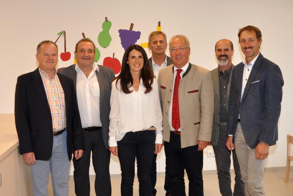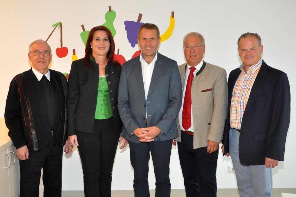 Große Freude über den gelungenen Kindergartenzubau: v.l.n.r.: LAbg. Rudi Raffelsberger, Bürgermeister Hans Kronberger, KiGa-Leiterin Alexandra Moser, Vizebgm. Anton Pühringer und Pfarrer P. Burkhard Berger.