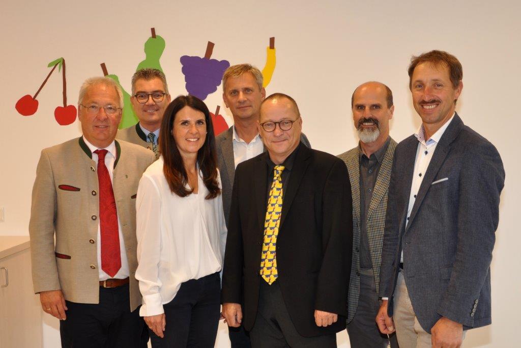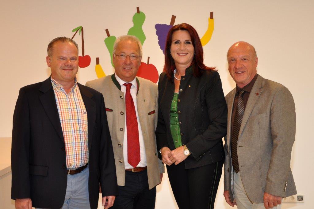 Große Freude über den gelungenen Kindergartenzubau: v.l.n.r.: LAbg. Rudi Raffelsberger, Bürgermeister Hans Kronberger, KiGa-Leiterin Alexandra Moser, Vizebgm. Anton Pühringer und Pfarrer P. Burkhard Berger.