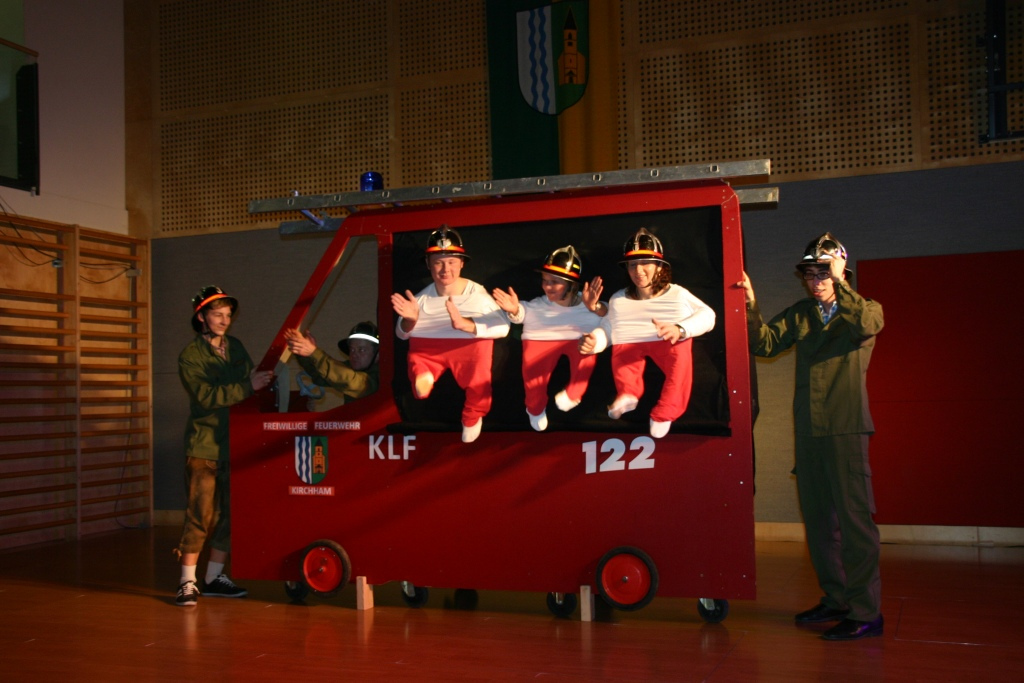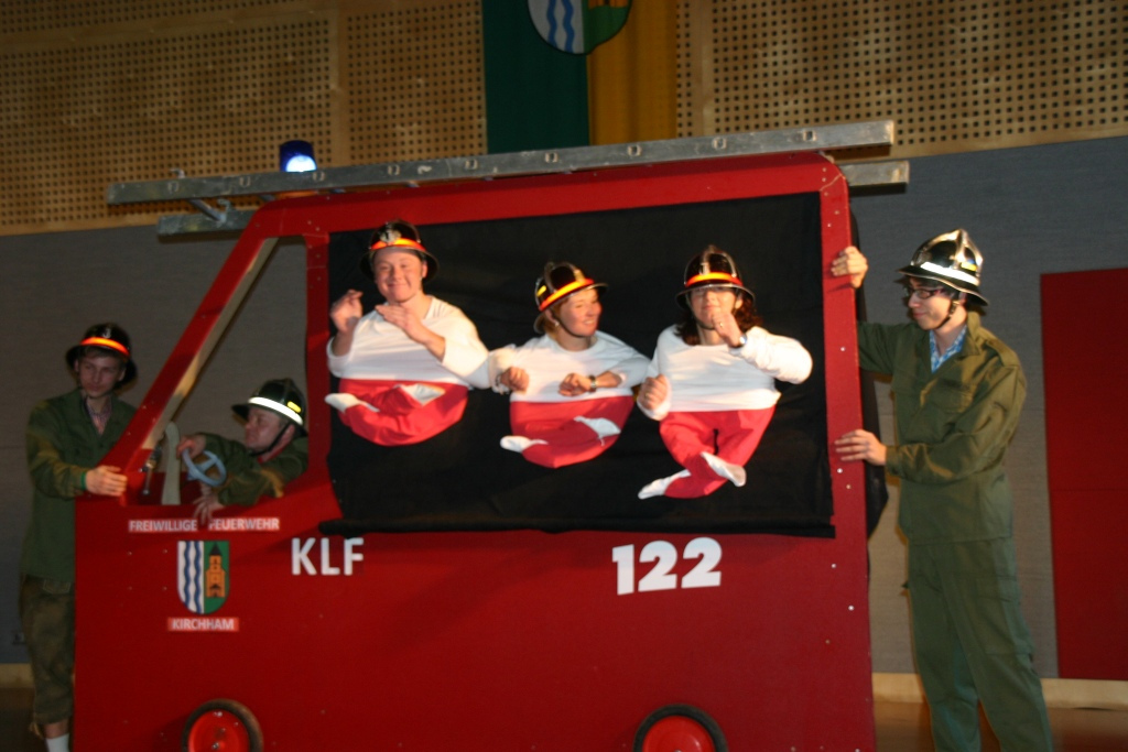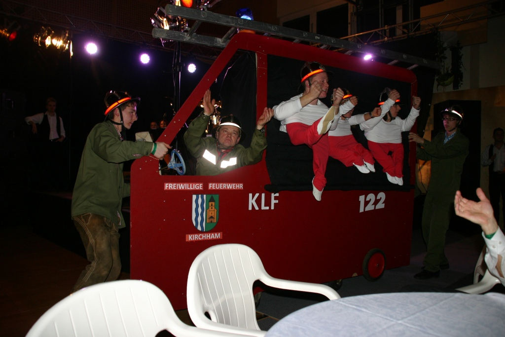 Die Tanzpausen nutzten so manche Ballbesucher für eine kleine Verschnaufpause an der Seiterlbar der JVP oder mit einem Gläschen Wein im Foyer. Besonderen Anklang fand auch die heuer erstmalige Cocktail-Bar auf der Galerie. Das Team von Fit and more kredenzte dabei sieben sehr interessante Mixgetränke von Sex on the beach bis Coconut Kiss. Für alle Jungen und Junggebliebenen ging es in der Judo-Kellerbar heiß her. DJ Eddy sorgte dort für eine entsprechende Partystimmung. Ein besonderer Höhepunkt war wieder die Mitternachtsshow. Mit einem fulminanten Auftritt der Zumbagruppe von Fit and more unter der Leitung von Susanne Rescheneder startete der erste Teil und die Besucher belohnten den kräfteraubenden Auftritt mit tosendem Applaus. Dementsprechend strapaziert wurden die Lachmuskeln im zweiten Teil des Showacts. Bei einem Feuerwehreinsatz der „FF Kirchham“ (Familien Mayrhofer, Pühringer, Söllner, Stöttinger) mit originell nachgebauten Feuerwehrauto ging´s so richtig zur Sache. Angriff Löschen und Lachen lautete der Einsatzbefehl, den alle Mitwirkenden perfekt ausführten.