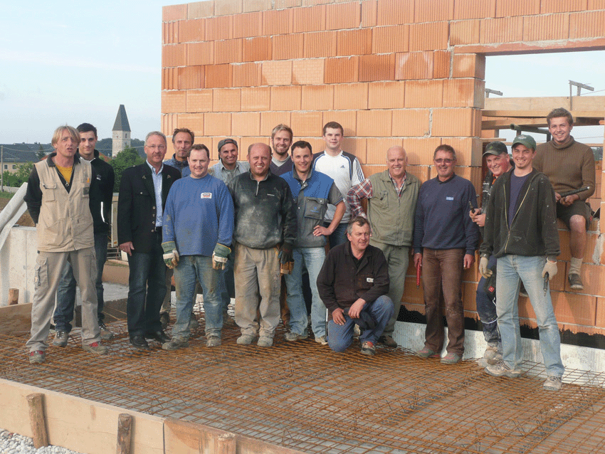 Anläßlich seines Besuches in Kirchham überrbrachte  Landesrat Dr. Josef Stockinger die Zusage über die Finanzierung der Sport-und Freizeitanlage "Traunstein-Arena";  damit war grünes Licht für den Bau des Clubheimes gegeben. Das Clubgebäude wird unter der Bauherrschaft der Union Kirchham errichtet. Präsident Rudi Seyr und seine zahlreichen Mannen der Fußballsektion starteten sogleich mit großem Elan. Perfekt organisiert von Sektionsleiter Ing. Manfred Hochreiter und seinem Team (Bauleitung Josef "Fidi-Flankengott" Stadler) wird das Bauwerk in Rekordzeit fertiggestellt sein. Unser Foto zeigt die zahlreichen und professionell arbeitenden Mitgliedern des UFC Kirchham mit Bürgermeister Hans Kronberger, der sich für die vielen freiwilligen Stunden und die enorme Eigenleistung der Sportunion sehr herzlich bedankt.