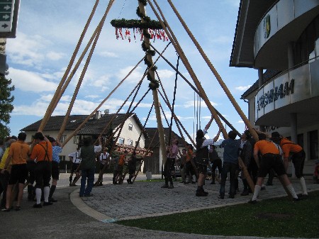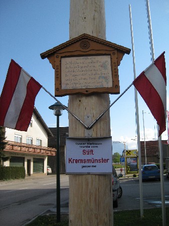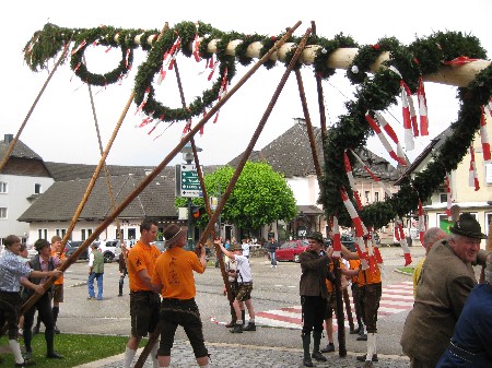 | Eine 30m hohe und mit Kränzen wunderbar geschmückte Fichte ziert wiederum für einen Monat den Ortskern von Kirchham. Gespendet wurde der Baum dieses Jahr dankenswerterweise vom Stift Kremsmünster. Initiator dafür war Josef Bammer (Priglhof), der Forstmeister P. Gotthard um einen Maibaum aus dem Hofholz bat, und den Baum auch fachmännisch fällte. Von dieser Aktion erfuhren auch andere und so wurde der bereits zum Abtransport vorbereitete Baum von der LJ Kirchham gestohlen. Mit viel Engagement und Kraftaufwand brachten die Diebe den 30 Meter langen Baum sogar über die Gemeindegrenze zum ehemaligen Obmann Raffelsberger Andi. Wie es in Kirchham so üblich ist, einigten sich der Trachtenverein und die Landjugend gütlich und so halfen die Burschen der Landjugend sogar am Samstag beim Aufstellen des Maibaumes mit. Unter den Zuschauern waren auch KSR Pfarrer P. Burkhard sowie Bgm. Johann Kronberger, die sich über den schönen Maibaum freuten. Als Dankeschön lud Bgm. Johann Kronberger den Trachtenverein D´Hochkogler und die "Diebe" zu einem köstlichen "Bratl in der Rein" ins GH Pöll ein. |