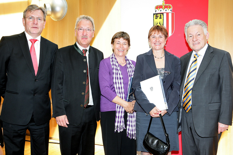 Mit den beiden neuen Schulrätinnen Dipl-Pädagogin Cäcilia Peyer und Dipl-Pädagogin Pauline Danninger freuten sich Landeschulratspräsident Fritz Enzenhofer, LH Dr. Josef Pühringer und Bürgermeister Hans Kronberger bei derVerleihung der Dekrete in der oö Landwirtschaftkammer in Linz.