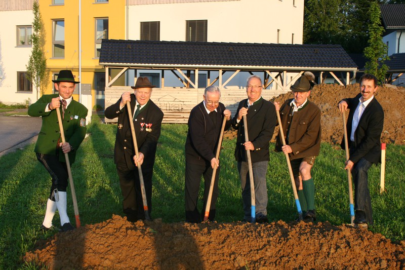 Am Mittwoch, 27. August lud Bürgermeister Hans Kronberger zum Spatenstich für das neue Vereinsheim, in dem hinkünftig Musik- und Trachtenverein sowie der Kameradschaftsbund ihre Heimstätte haben werden. Er durfte dazu Herrn Pfarrer P. Burkhard, Vizebürgermeister Anton Pühringer mit den Gemeindevorständen Gabi Medl, Klaus Bammer und Günter Hartleitner, Amtsleiter Alois Jungwirth, Feuerwehrkommandant Gerhard Hutterer, Architekt Mag. Georg Hochleitner mit Bauleiter Ing. Helmut Ramsimmer sowie Obleute, Funktionäre und Mitglieder vom Musik- und Trachtenverein sowie des Kameradschaftsbundes begrüßen. Nach einem Marsch des Musikvereins dankte Ortschef Kronberger für die ausgezeichnete Zusammenarbeit bei der Planung dieses Projektes, das mit einem Kostenvolumen von ca. 1,1 Millionen Euro zu den größten Einzelprojekten der Gemeinde Kirchham zählt. Die Bauarbeiten sollten im Mai des kommenden Jahres beendet sein. Der Eröffnungstermin wurde mit 28. Juni 2015 ebenfalls bereits fixiert; aller Voraussicht wird dabei Landesrat Max Hiegelsberger das neue Vereinsheim seiner Bestimmung übergeben. Nach dem Spatenstich, bei dem sich sogar die Sonne an diesem verregneten Tag zeigte, klang in der Fahrzeughalle des benachbarten FF-Haus bei Bier und Würstln die Feierstunde gemütlich aus.