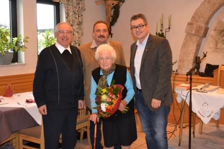 Foto: Pfarrer P. Burkhard, GR Alfred Platzer-Reingruber und Sozialreferent Ingo Dörflinger überreichten Maria Kronberger als ältestes Besucherin einen Blumenstrauß!
