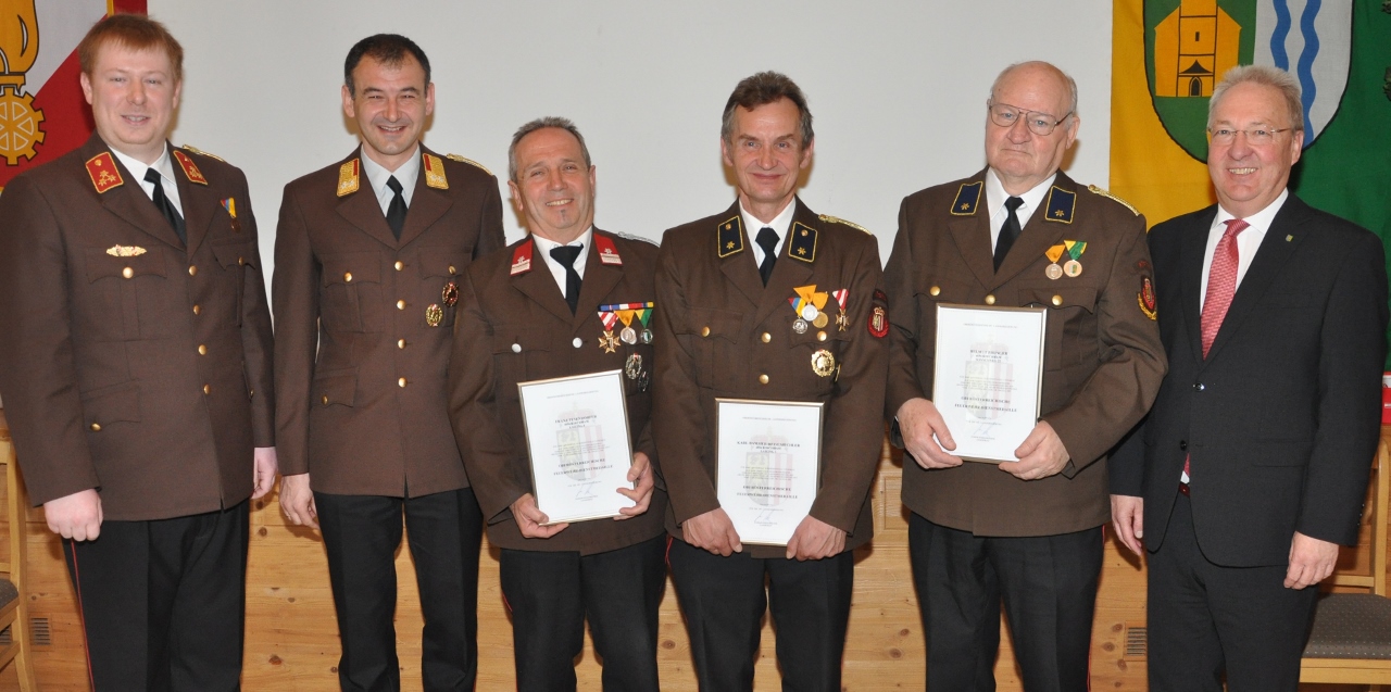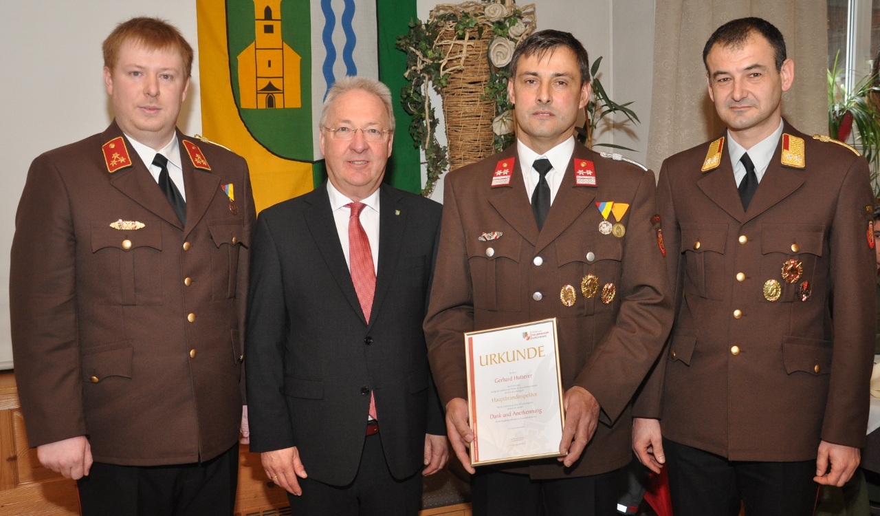 Foto (A.Steinbach):  v.l.n.r. Kommandant Ing. Bernhard Hutterer, Bürgermeister Hans Kronberger, der neue Ehren-Kommandant Gerhard Hutterer und Abschnittskommandant Thomas Dreiblmeier.