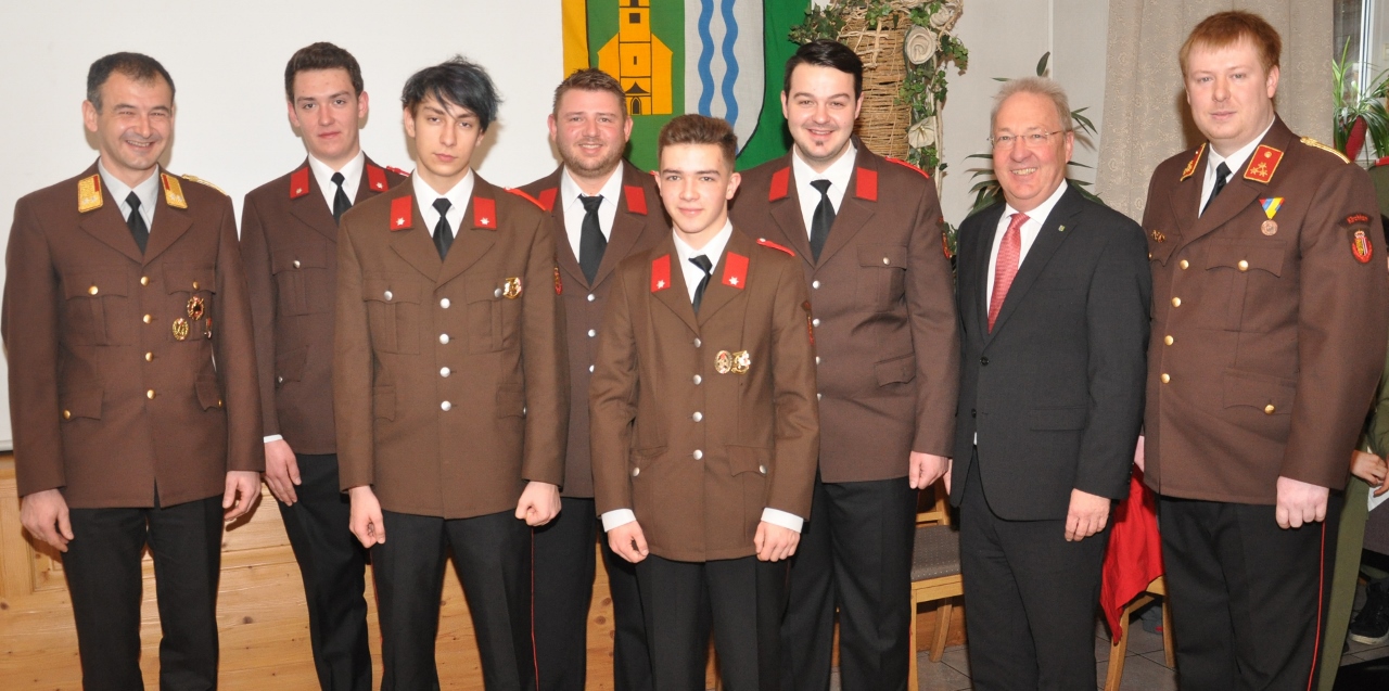 Foto mit neu aufgenommenen Mitgliedern: v.l.n.r.: Abschnittskdt. Dreiblmeier, Daniel Spitzbart, Sebstian Forstinger, Harald Holzinger, Fabian Baumgartinger, Manuel Prinstinger, Bgm. Hans Kronberger und Kdt. Bernhard Hutterer
