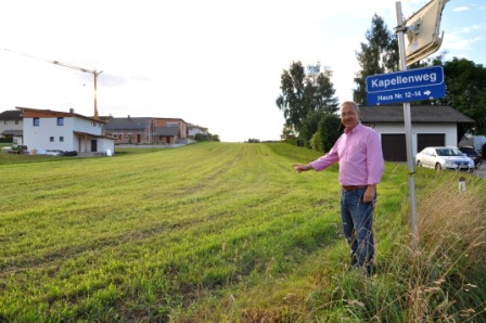 Foto (M. Steinbach): Bgm. Kronberger sichtlich erfreut über die Parzellierung eines seit vielen Jahren gewidmeten Baugrundstücks der Familie Baumann („Ortbauer“). |